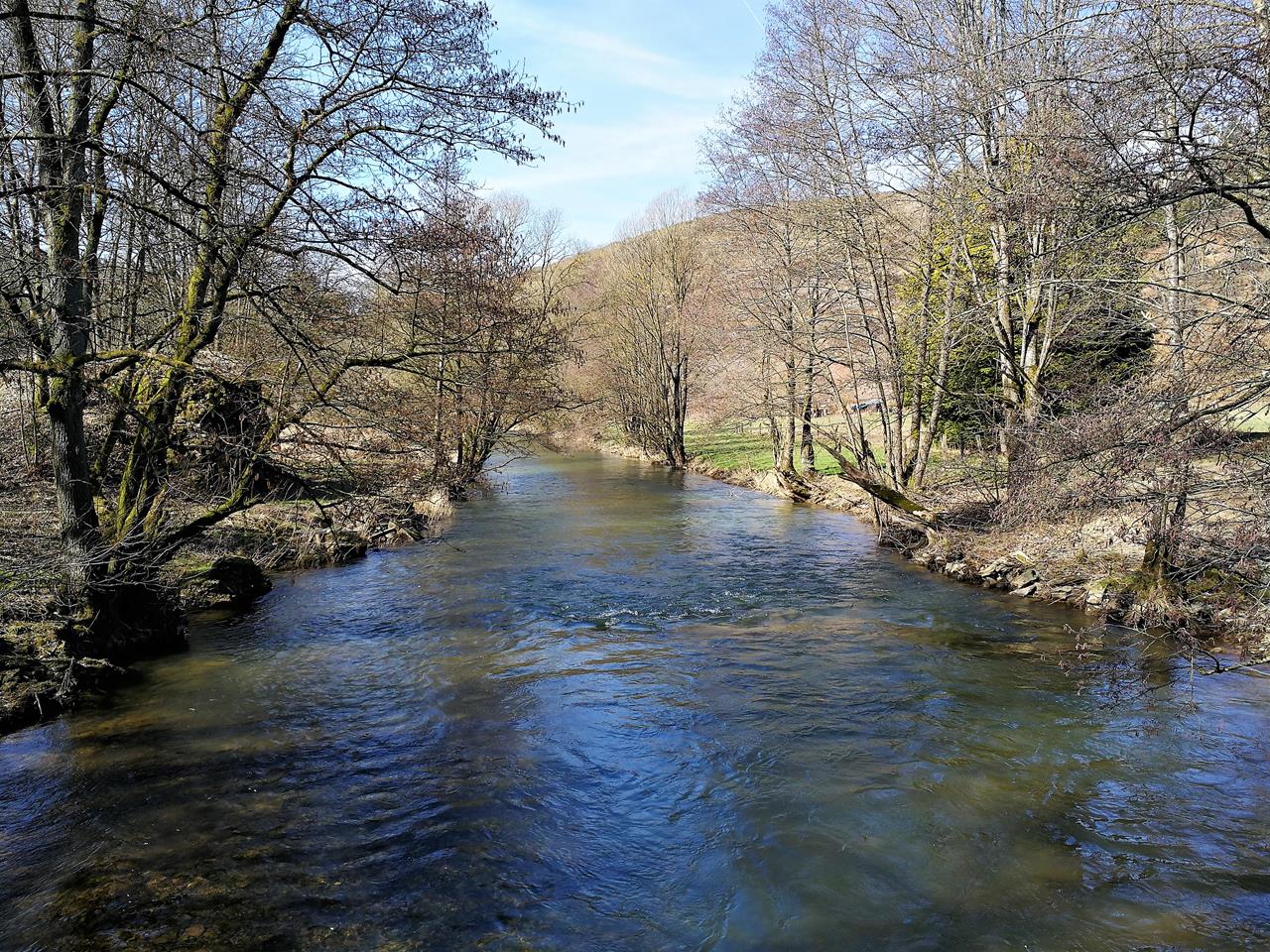 Nun drehen wir in östlicher Richtung ab und steigen durch Wald hinab in Richtung der Deutsch-Belgischen Grenze an der Our. Bald geht es in südlicher Richtung zunächst zum Ort Auel und dann weiter Richtung Süden parallel zur Irmsch, einem Wildbach, der hier die Grenze bildet.
