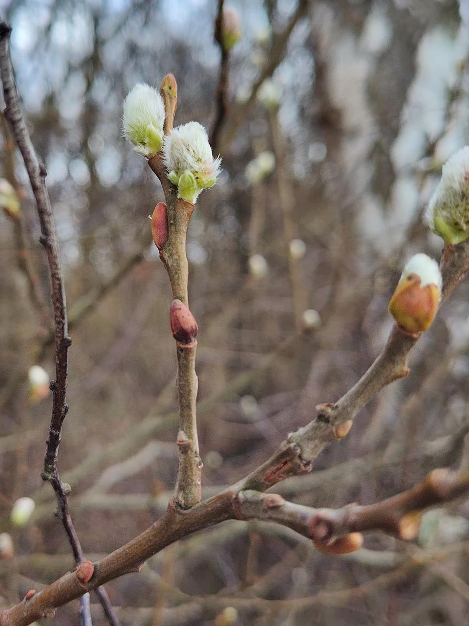 Heute ist es kalt und windig, doch die Vegetation verrät, dass der Frühling naht. So öffnen sich an den Weidenkätzchen im Wald bereits die ersten Knospen, und eine rosa Zierkirsche entlang unseres Weges hat bereits zu blühen begonnen.