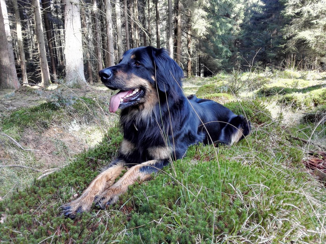 M;ärz 2017: Doxi macht es sich auf einem Bett aus Moos im Arnsberger Wald gemütlich
