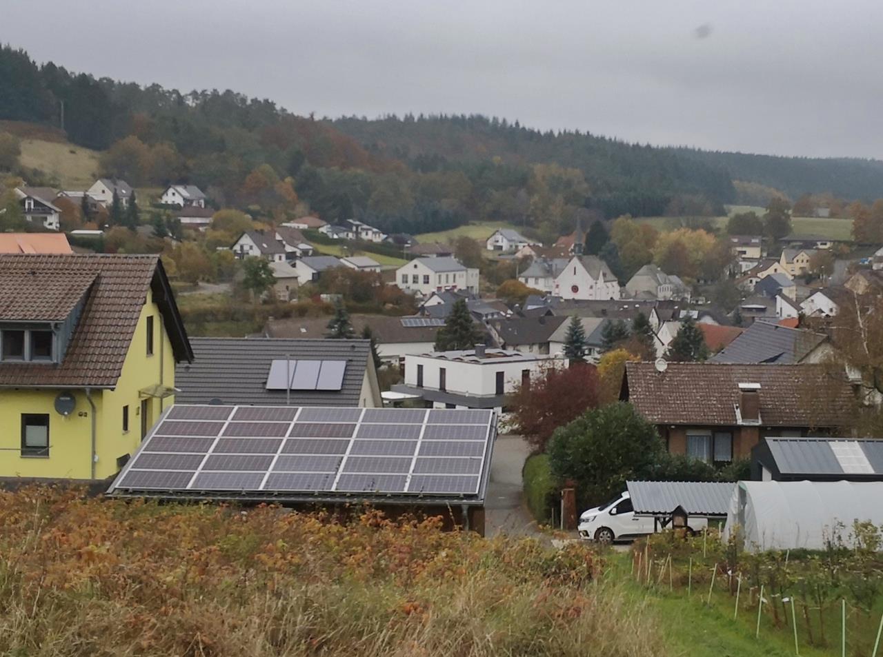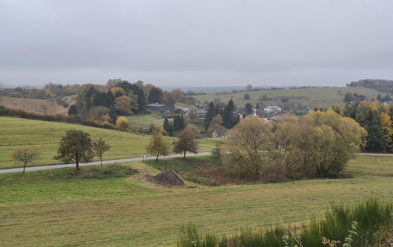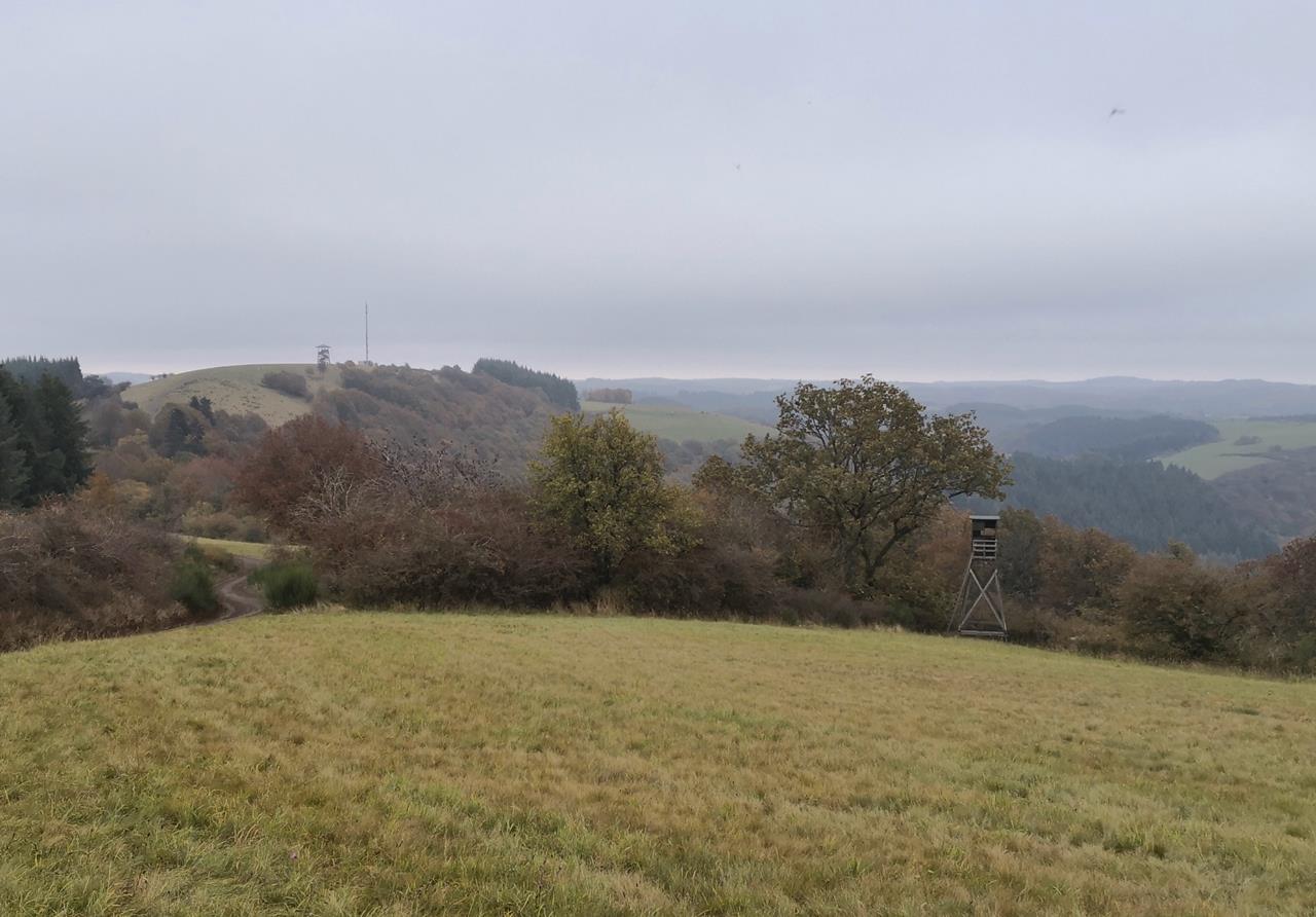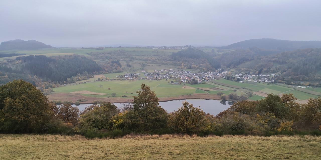 Mit dem PKW wäre das vermutlich kein Thema, aber mit dem Wohnmobil muss man schon ganz schön aufpassen beim Bremsen und Schalten und Steigen. Ich bin wirklich froh, als ich wohlbehalten auf dem hübschen kleinen Stellplatz oberhalb von Deudesfeld angekommen bin.Von dort unternehme ich am späten Nachmittag mit Doxi eine schöne Wanderung, die uns zunächst zum Aussichtsturm „Landesblick“ auf den grasbewachsenen Höhen über Meerfeld führt. Von dort hat man einen herrlichen Blick hinunter in den Ort und zum Meerfelder Maar.