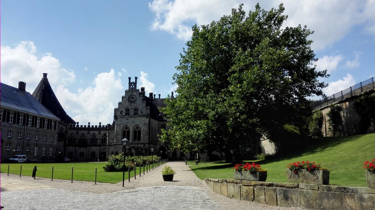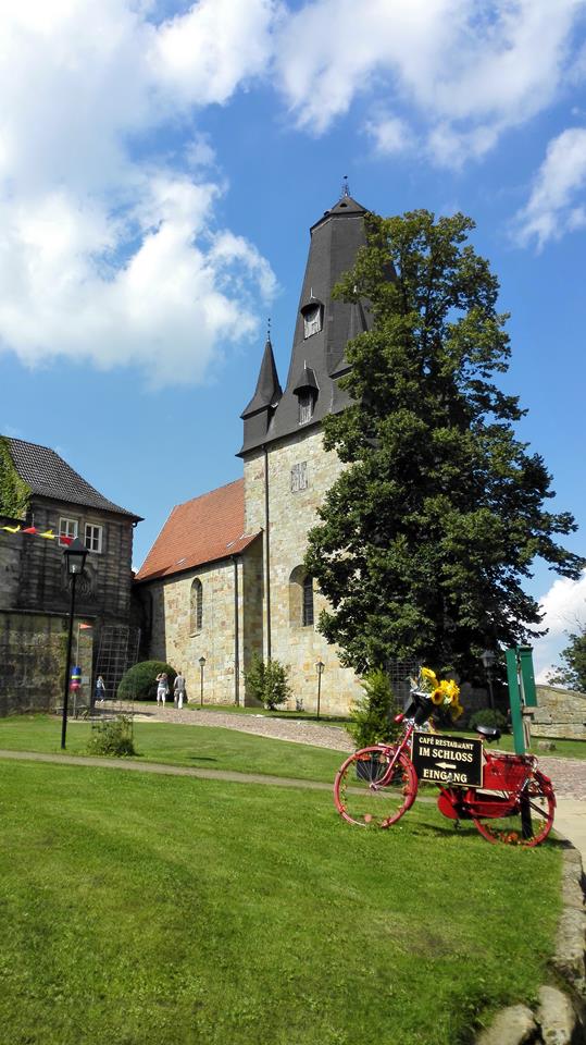 Die Burg steht auf einem großen Felsen aus Bentheimer Sandstein hoch über der Stadt. Dieser „Bentheimer Höhenrücken“ ist der letzte westliche Ausläufer des Teutoburger Waldes.Die gesamte Anlage ist heute als Museum besuchbar. Bis auf einen kleinen privaten Teil, in dem weiterhin Angehörige der Grafen von Bentheim und Steinfurt wohnen, können alle Bereiche der Burg von Besuchern erkundet werden. Weil ich Doxi dabeihabe, muss ich darauf heute aber leider verzichten.