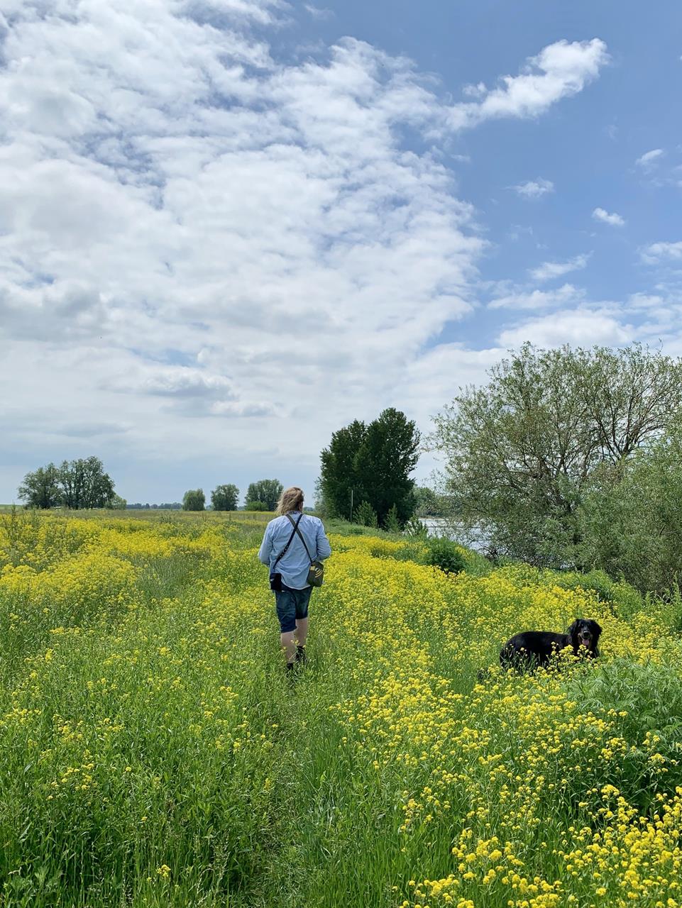 Auf unserem Weg nach Süden stoßen wir bald auf den Grindsee. Dort laufen wir durch die Wiesen zum Rhein, vorbei an ausgedehnten Flächen mit wildem, gelb blühendem Raps und lila blühendem Schnittlauch.