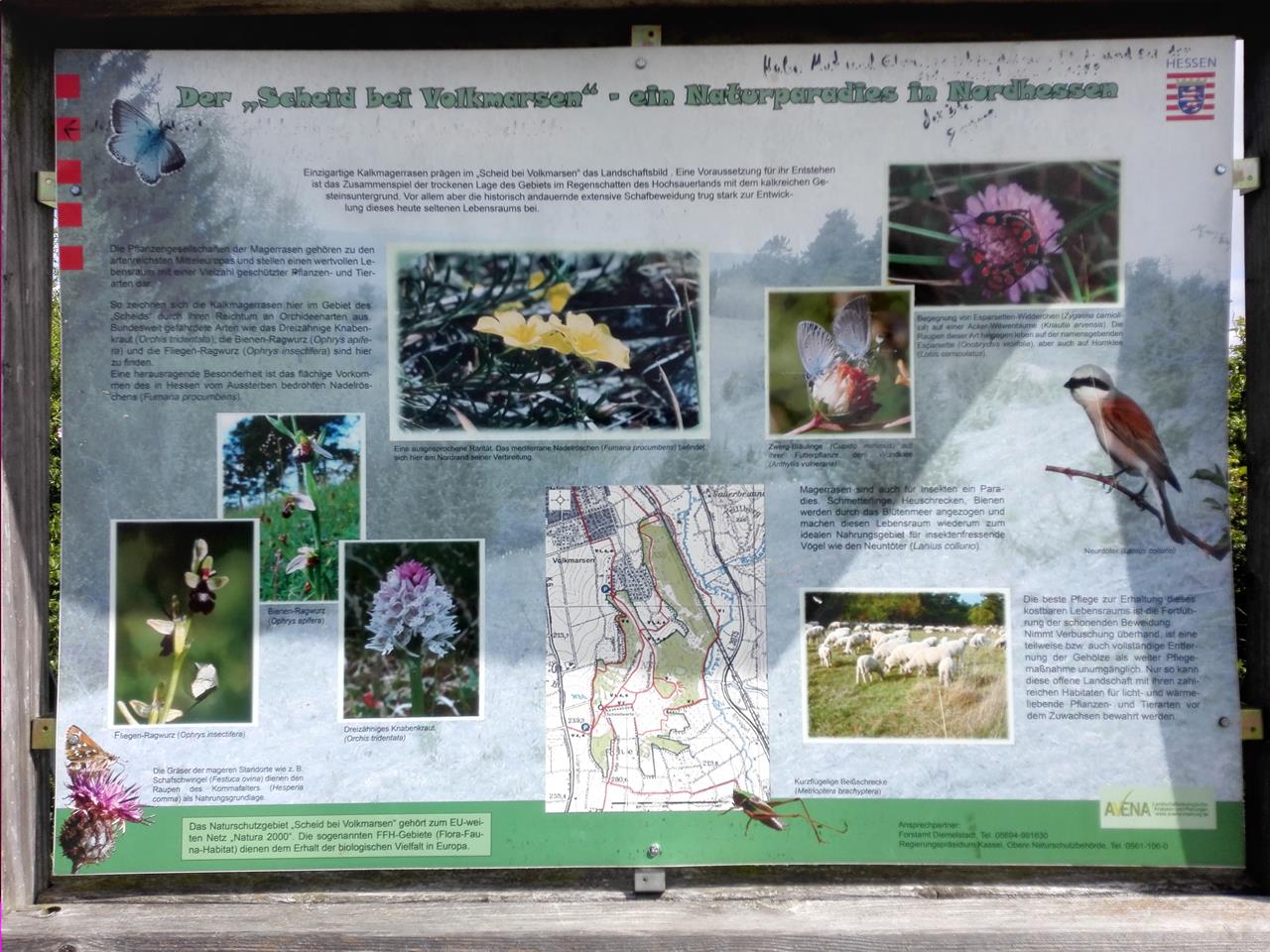 Wir laufen zunächst durch das historische Zentrum des kleinen Ortes rund um die Kirche und das Rathaus. Dann geht es in südlicher Richtung hinauf auf das aus Muschelkalk entstandene Hochplateau der Scheid.Viele seltene Pflanzen und Tiere sind auf diesem Höhenrücken beheimatet. Zwischen landwirtschaftlich genutzten Feldflächen und von Insekten umschwärmten Magerrasenwiesen bieten sich uns hier herrliche Fernblicke auf die umliegenden Berge des Waldecker-Hügellandes.
