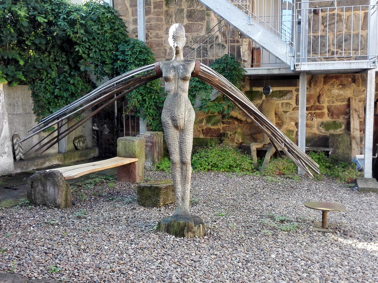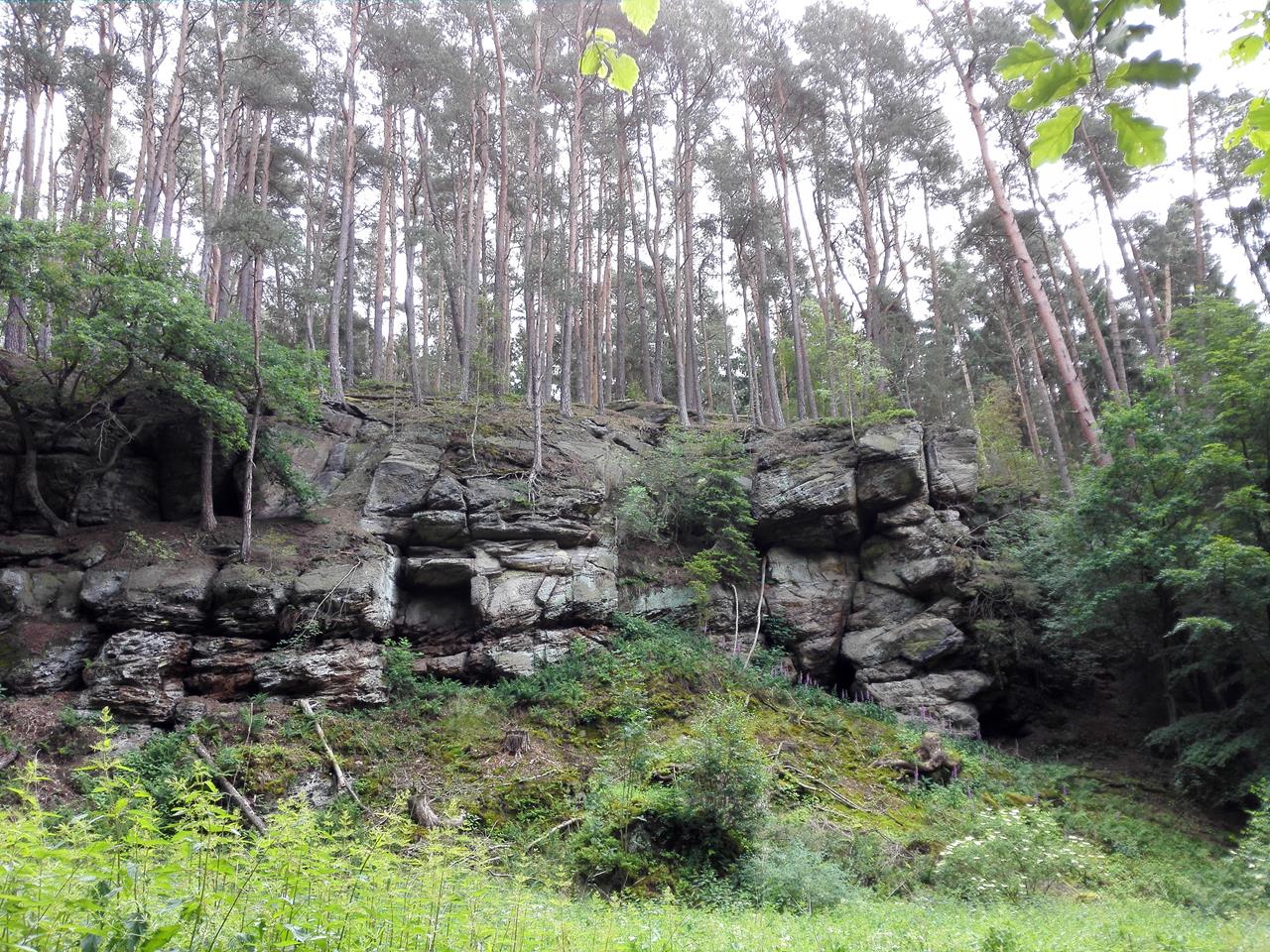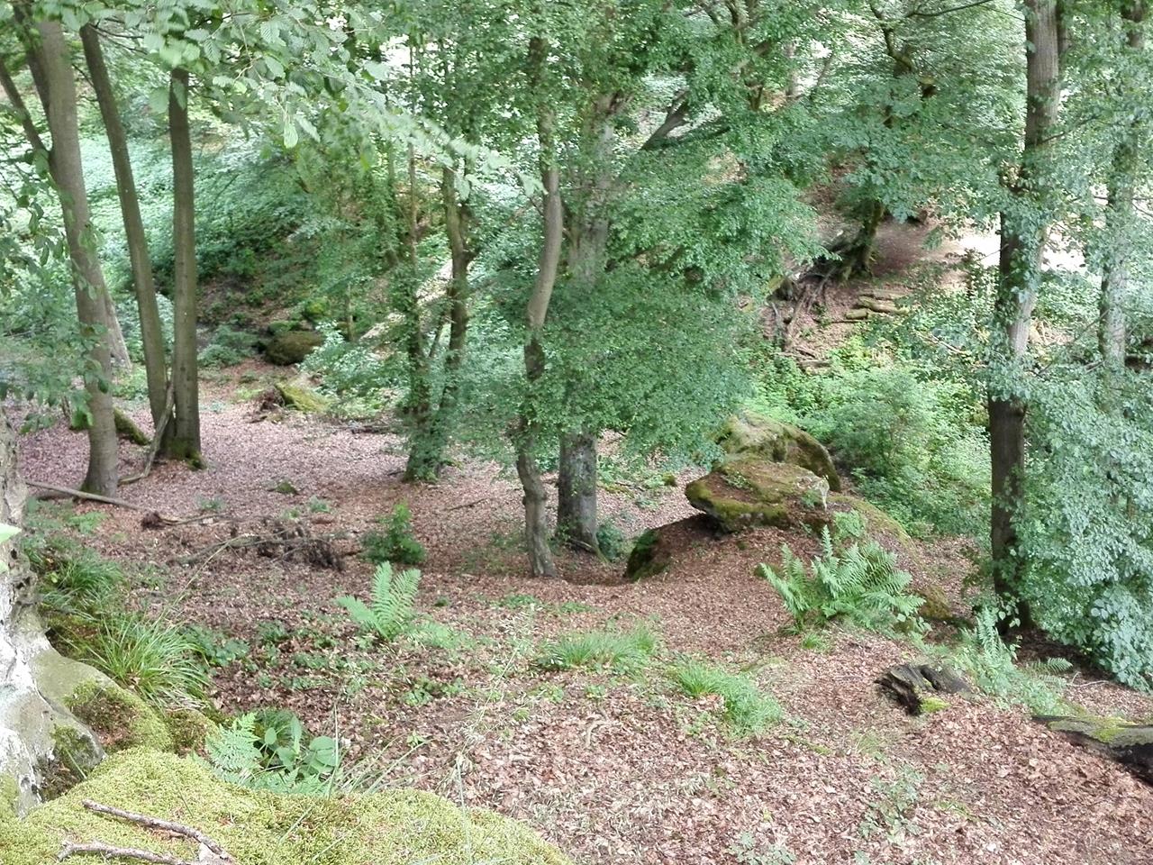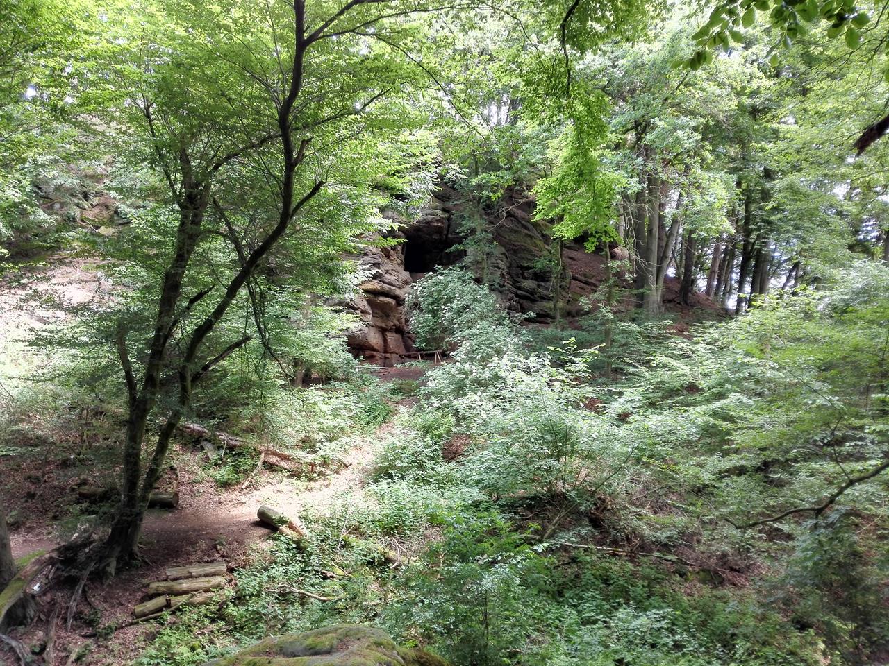 Der kleine Bach hat sich tief in den weichen Sandstein eingegraben und dabei bizarre Felsformationen geschaffen. Auf der gegenüberliegenden Bachseite sehen wir in der Felswand die Höhle „Hollenkammer“, die früher ein germanischer Kultort war und heute von Fledermäusen bewohnt wird.