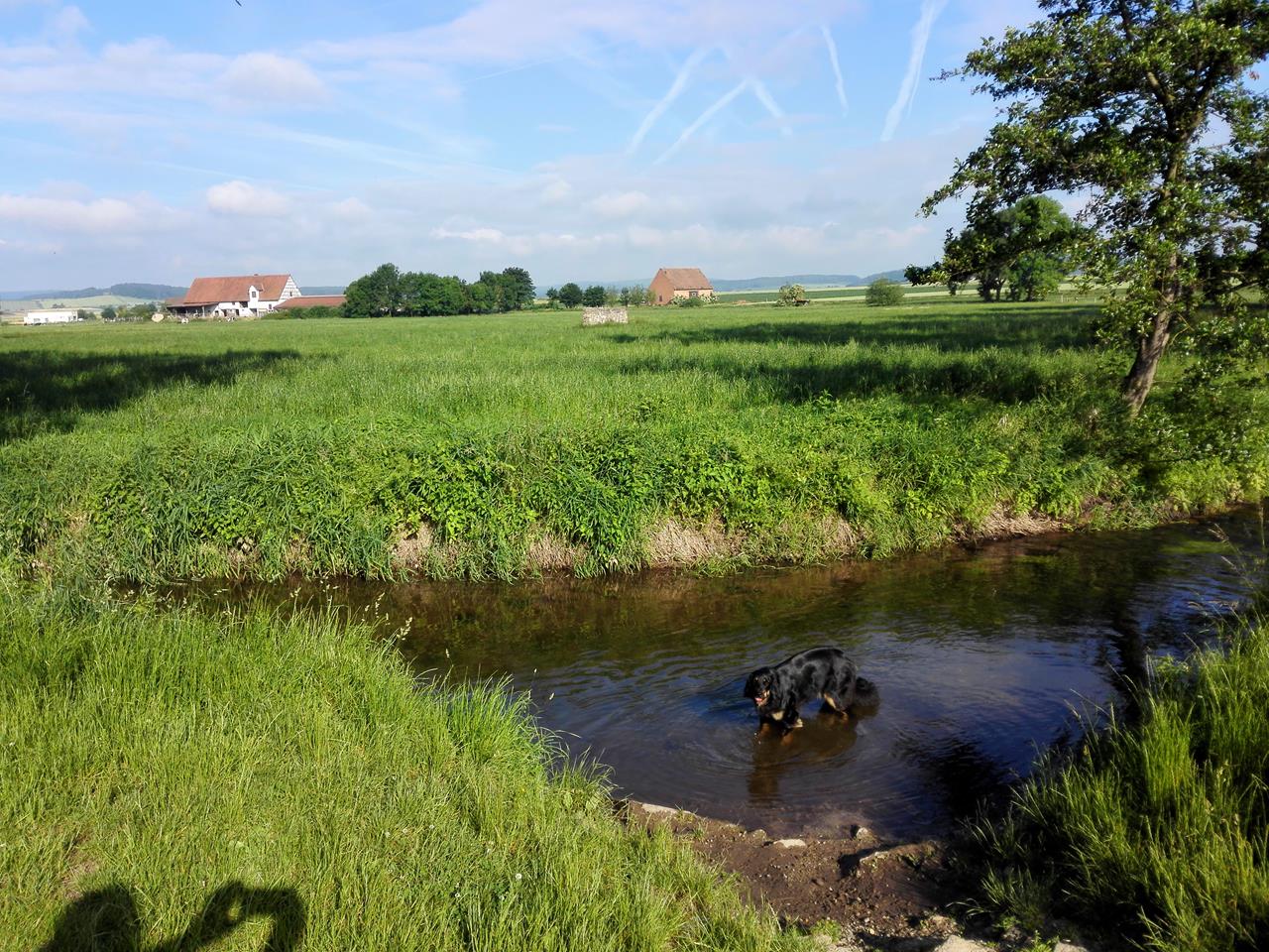 Wir folgen dem idyllischen Bachlauf durch den Wald und kommen am Talausgang an der markanten Felsenlandschaft „Katte-Kurts-Klippen“ vorbei. Nun geht es über hoch liegende Feldflächen wieder zurück nach Volkersheim, wo wir nach knapp 20 Wanderkilometern erneut unseren Startpunkt erreichen. Da es ziemlich heiß ist, kühlen Doxi und ich erst einmal unsere Füße im kühlen Wasser der Twiste. Was für eine Wohltat!