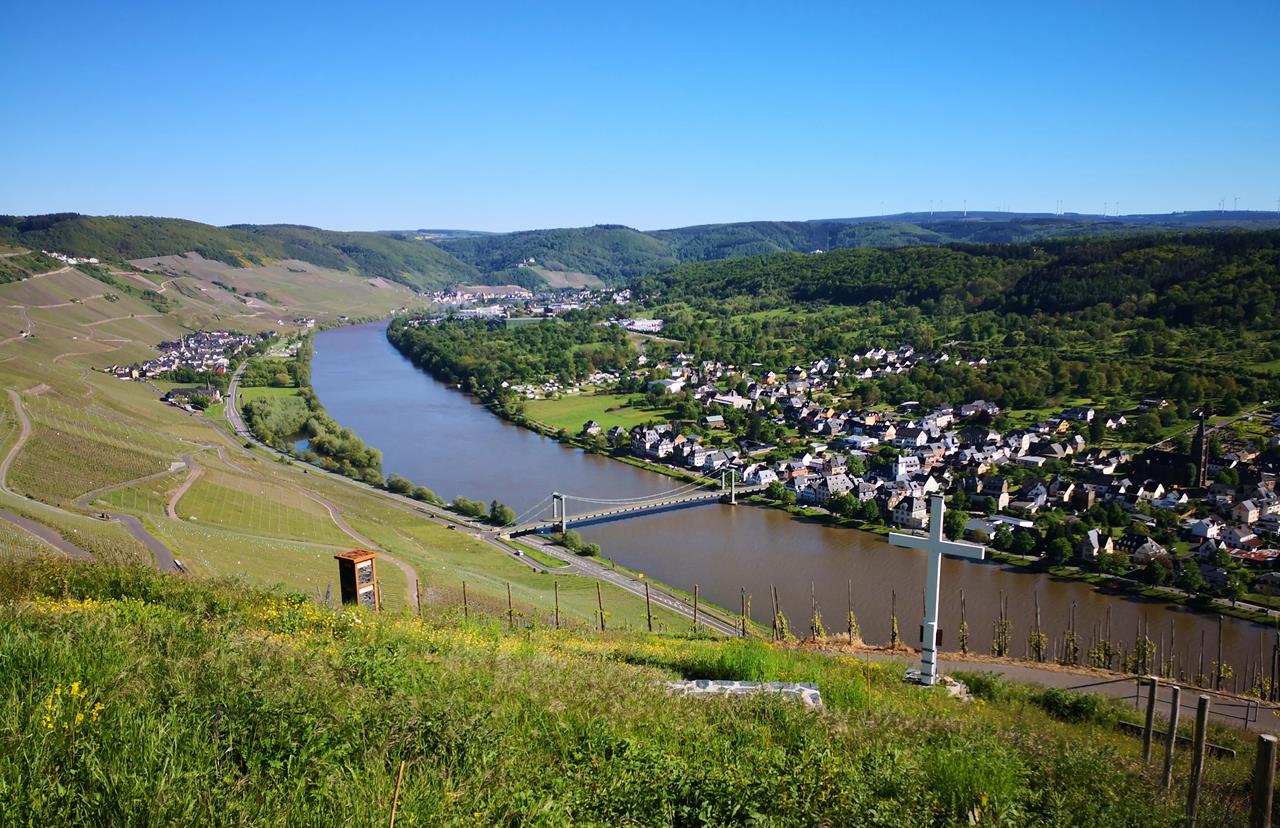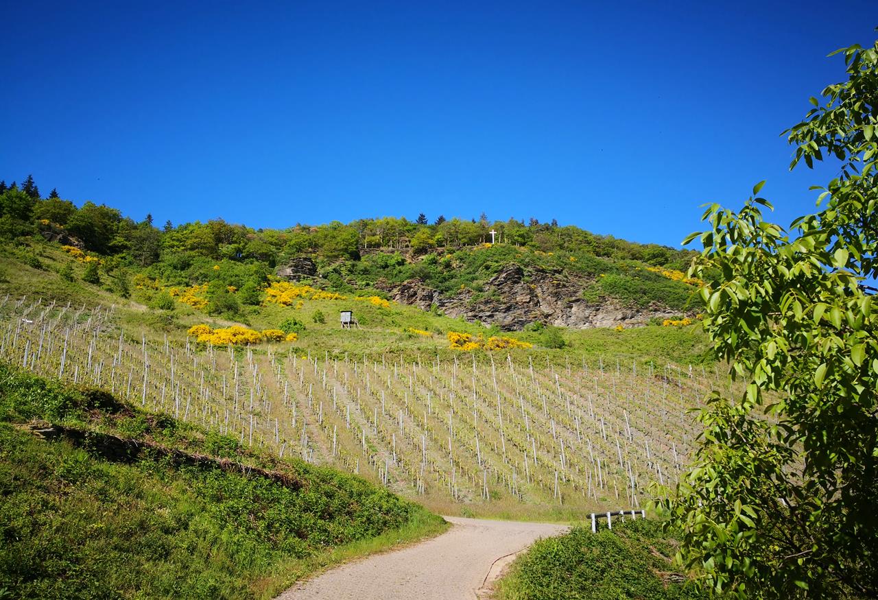 Wir laufen zunächst entlang der hübschen Uferpromenade und passieren bald den alten Marktplatz mit einigen sehenswerten Häusern. Hinter dem Friedhof geht es in die Weinberge und in Richtung der Ruine der Rosenburg, von der allerdings nur noch wenige Grundmauern erhalten sind. Rechts von uns blicken wir auf die große Moselschleuse von Zeltingen-Rachtig.Dahinter erblicken wir den Ort Wehlen und am Horizont Bernkastel-Kues. Immer höher steigen wir durch die Weinberge auf, bis wir an einem Rastplatz mit einem großen weißen Kreuz auf den Zuweg zum Moselsteig treffen. Der Weg entlang des Waldsaums bietet uns willkommenen Schatten, denn die tief stehende Nachmittagssonne hat uns in den Weinbergen bereits mächtig eingeheizt.