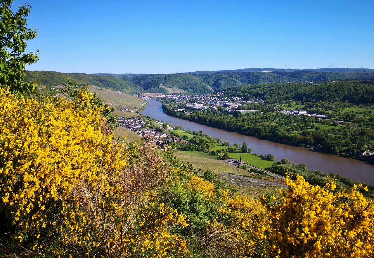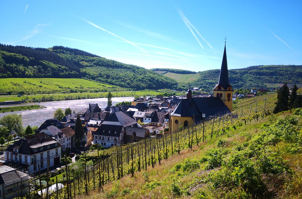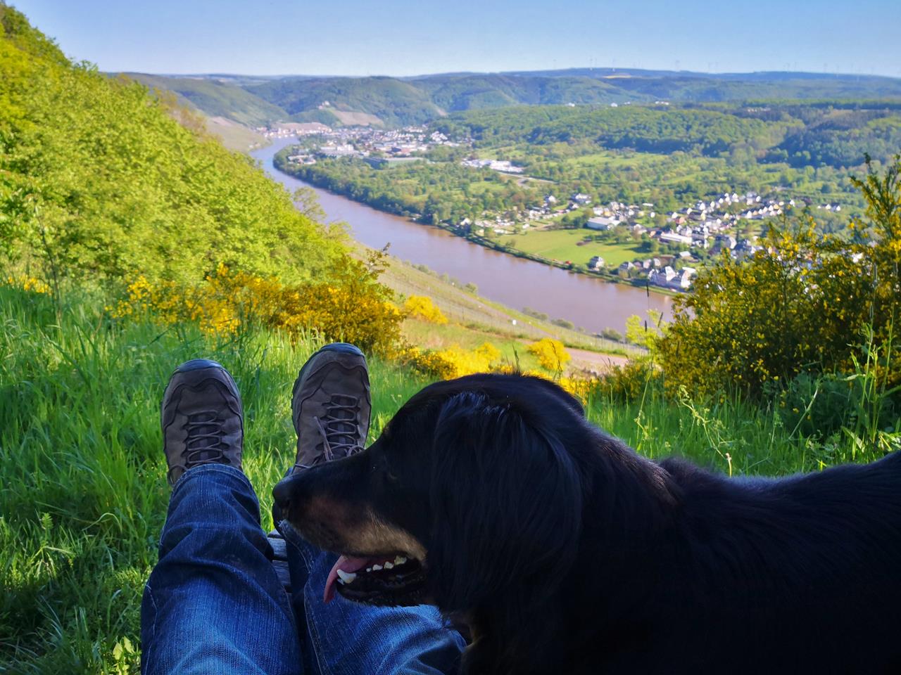 Bei der Weiterfahrt entlang der Mosel sind wir in Zeltingen-Rachtig gelandet. Hier gibt es einen schönen Womo-Stellplatz direkt an der Mosel, der nicht ganz so überlaufen ist, wie viele andere Stellplätze in der Region. Außerdem habe ich in meinem Wanderführer eine vielversprechende Wanderung entlang des Moseltals entdeckt, die ich mit Doxi am späten Nachmittag in Angriff nehme.