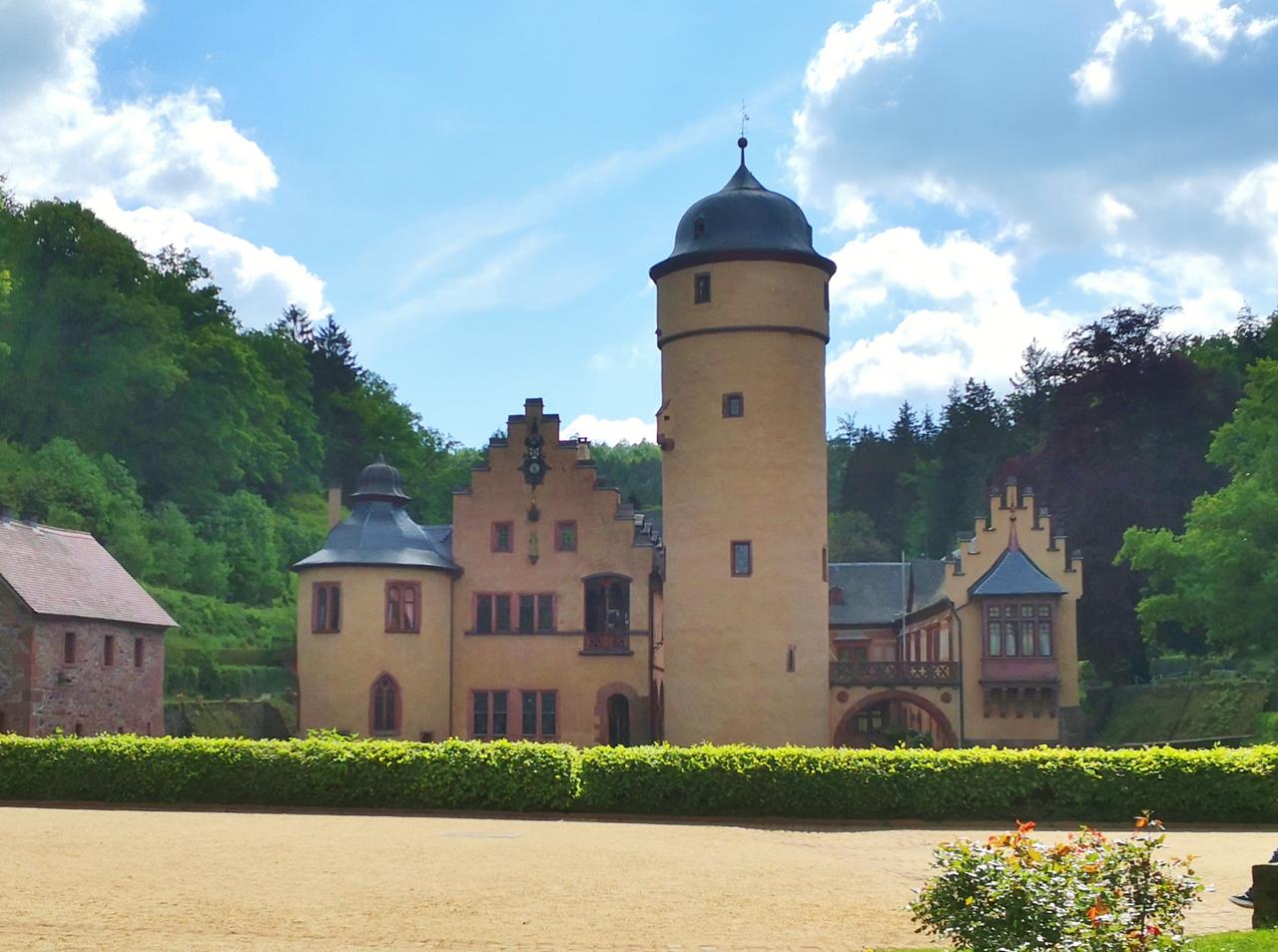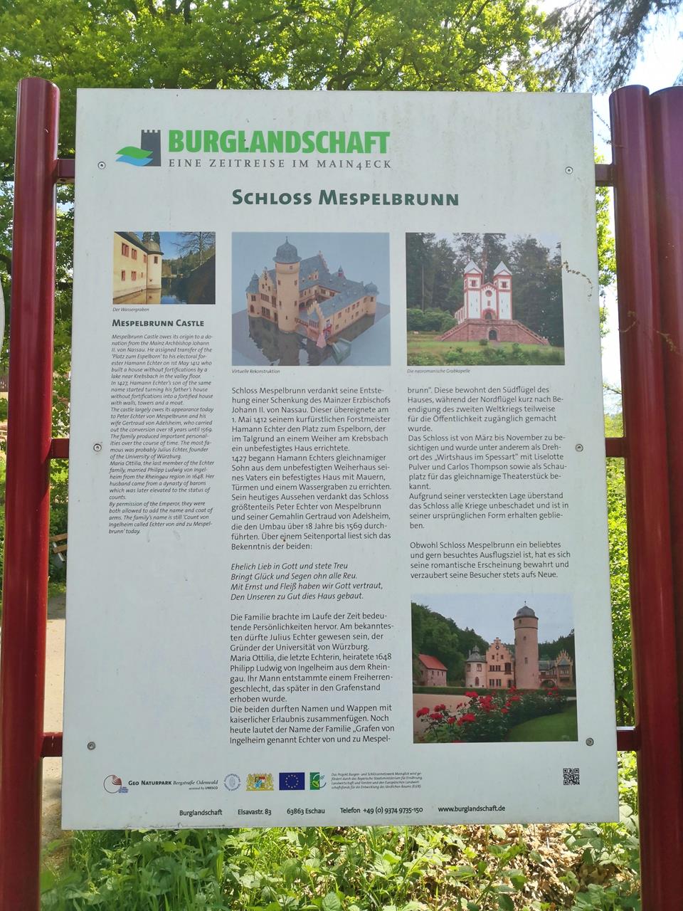 Geich hinter dem Ortsrand liegt Schloss Mespelbrunn, das seine Entstehung einer Schenkung des Mainzer Erzbischofs Johann II. von Nassau verdankt. Dieser übereignete im Jahre 1412 seinem kurfürstlichen Forstmeister im Spessart, Hamann Echter, eine „Wüstung und Hofstätte“ genannt Espelborn.
