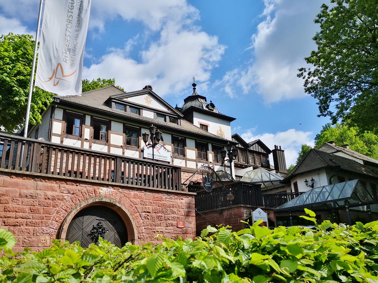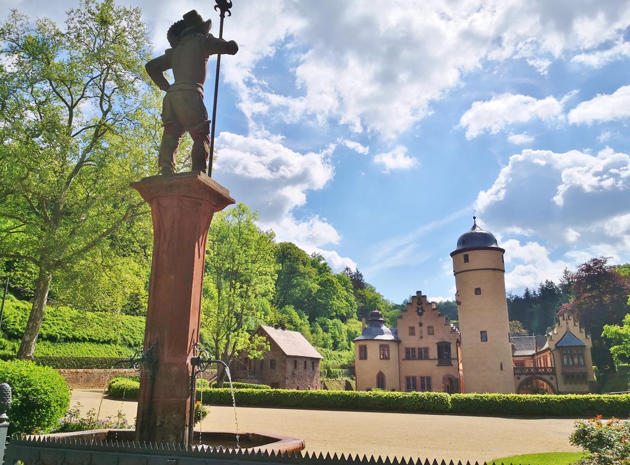 Durch seine romantische Lage und das von Kriegen unberührte malerische Erscheinungsbild hat Schloss Mespelprunn weltweit Bekanntheit erlangt. Jahr für Jahr zieht es bis zu 100.000 Besucher an.Auch ich möchte das Schloss gerne einmal sehen. Ich parke im Ortsteil Hessenthal von Mespelbrunn und laufe mit Doxi 4 Kilometer entlang des Elsava-Bachs durch den Talgrund zum Schloss.