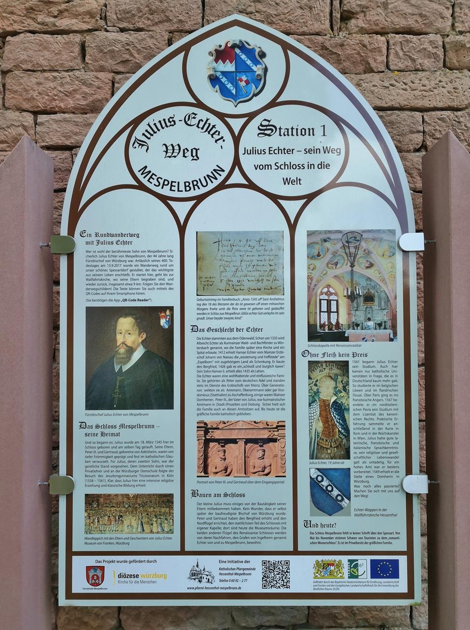 Eines ihrer Kinder, Julius Echter von Mespelbrunn, sollte später selbst zum Bischof von Würzburg und Fürst von Ostfranken aufsteigen. Ihm ist ein 8 km Rundweg zwischen dem Schloss und dem Ort gewidmet, dem wir auf einigen Abschnitten folgen.