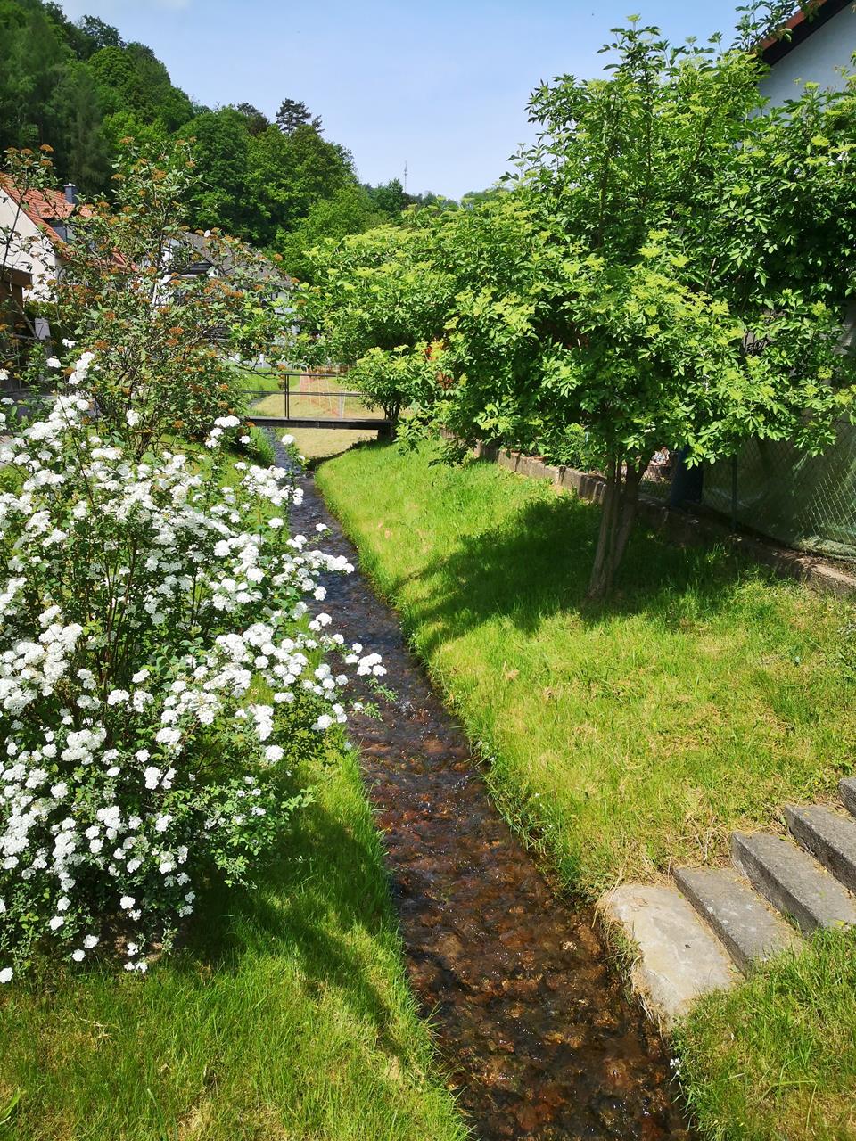 Es ist herrliches Wetter: Von oben scheint die Sonne und von unten rauscht der kanalisierte Bach lieblich durch den Ort.