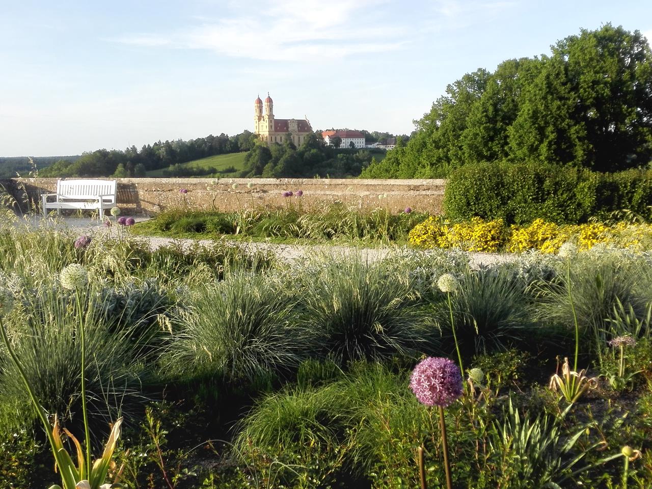 Von der Westseite blickt man hinunter auf die Innenstadt von Ellwangen. Von der Ostseite geht der Blick über einen schönen Garten hinweg zur markanten Schönenbergkirche auf einem benachbarten Hügel. Schade, dass es schon relativ spät ist, sonst würde ich mit Doxi noch zur Schönenbergkirche hinüberlaufen.