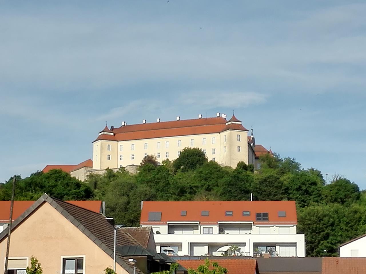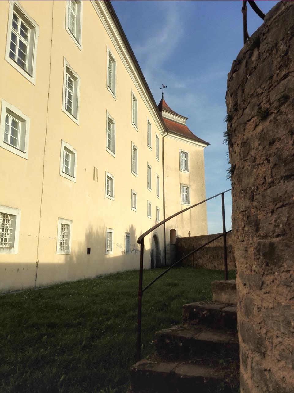 Bei der Annäherung an Ellwangen sieht man schon von weitem das Schloss, das oberhalb der Stadt inmitten von Streuobstwiesen auf einem Hügel thront. Das muss ich mir natürlich genauer ansehen. Also laufe ich am Abend mit Doxi hinauf zum „Schloss ob Ellwangen“, wie die weitläufige Anlage offiziell heißt.