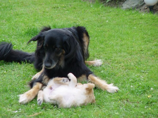 Ganz anders dagegen Bloxis Verhalten, wenn man einen oder zwei Welpen aus dem Welpenauslauf herausnimmt und zu ihr auf den Rasen bringt: Dann schmust sie zärtlich mit den Kleinen, fordert sie zum Spielen auf und springt freudig um sie herum. Ganz herzig sieht das aus.