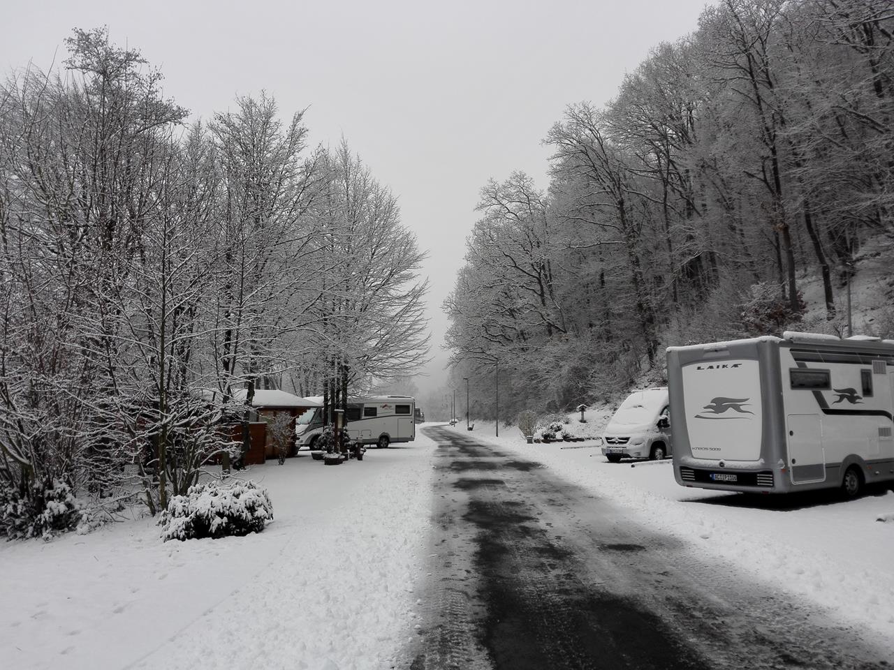 Upps, über Nacht ist unser Womo-Stellplatz in der Eifel richtig schön eingeschneit. Hatten wir gar nicht mit gerechnet. Und die anderen Camper wohl auch nicht. Am Morgen gucken alle ganz verdutzt. Aber schön sieht das aus. Und Doxi dreht sich vergnügt durch den Schnee. So macht der Winter Freude.