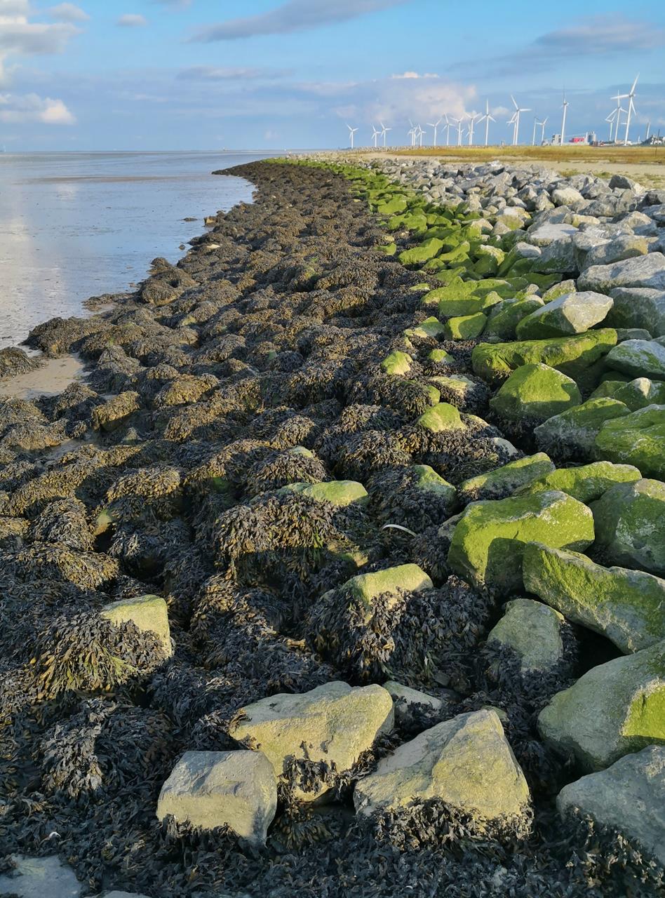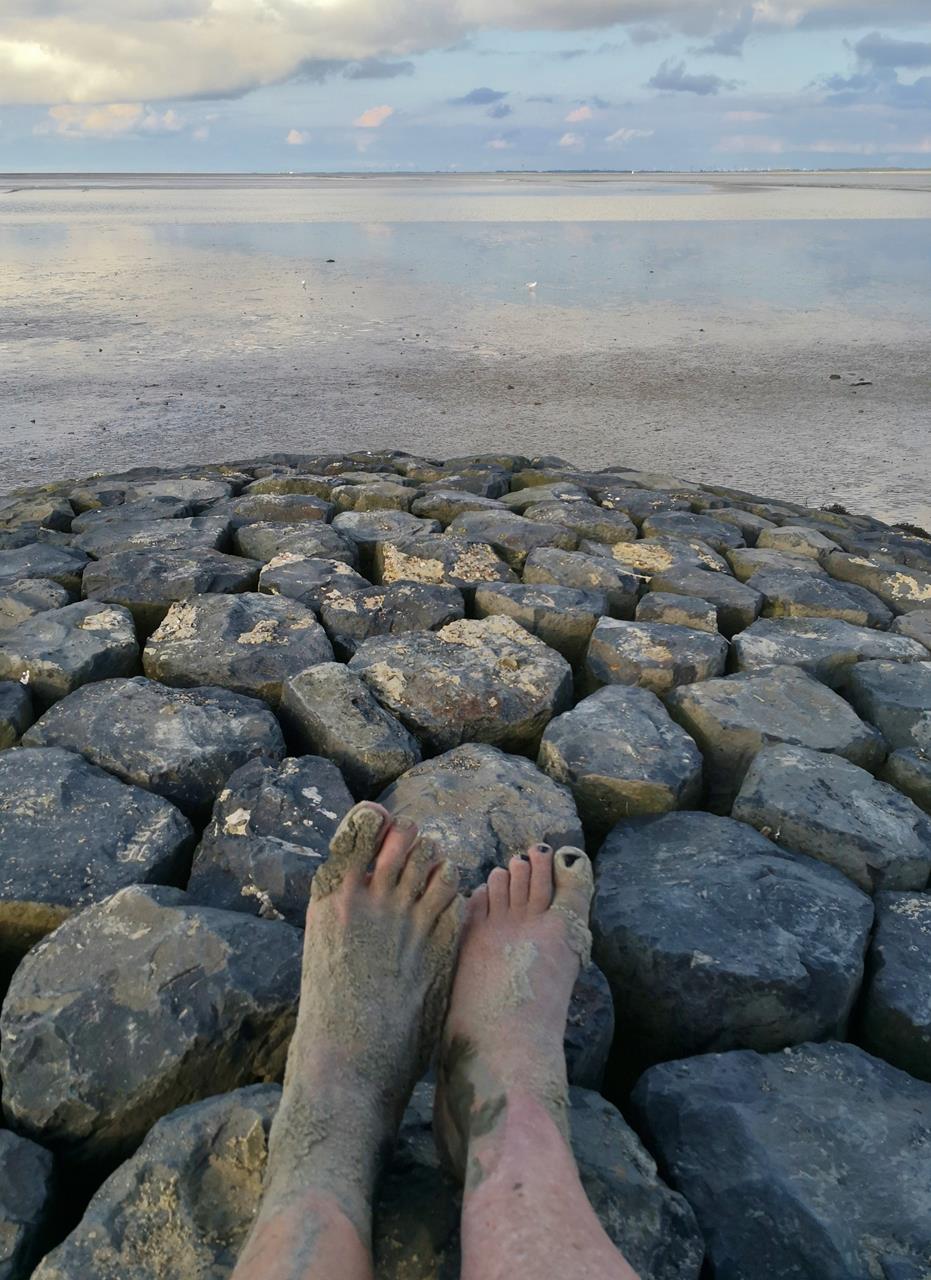 Am späten Nachmittag passen wir die Ebbe im Dollart ab für eine kleine Wattwanderung. Allzu weit kommen wir jedoch nicht, denn kaum 30 Meter vom Strand entfernt, ist der Schlick bereits knietief, sodass man kaum noch vorankommt.