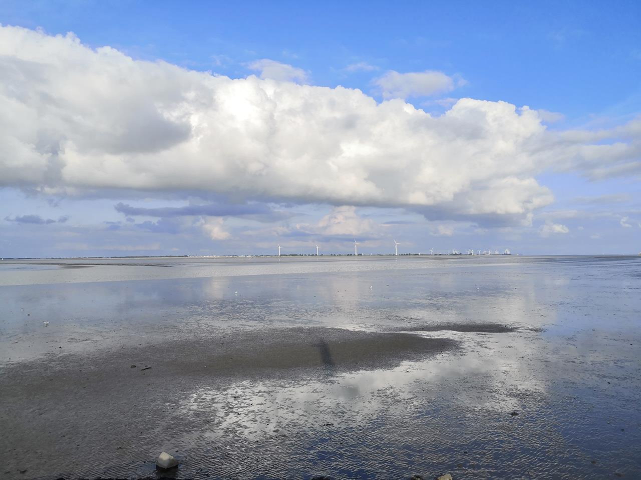 Einige Siele in Strandnähe führen zwar noch Wasser, doch weiter draußen können wir große Flächen ausmachen, die komplett trockengefallen sind. Toll sieht das aus, wie sich die Wolken in den nassen Flächen spiegeln.