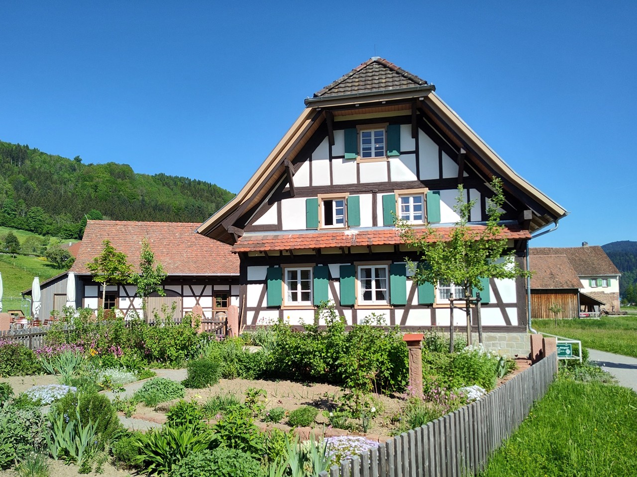 Blick in einen Bauerngarten, dahinter das Backhaus