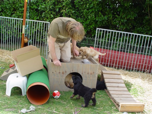 Man kann den Kleinen kaum noch entkommen, so schnell sind sie jetzt auf den Beinen. Auch ein Spurt von einer Ecke des Welpenauslaufs über die Rampe in die Garage und in die Wurfkiste bringt sie nicht mehr aus der Puste.
