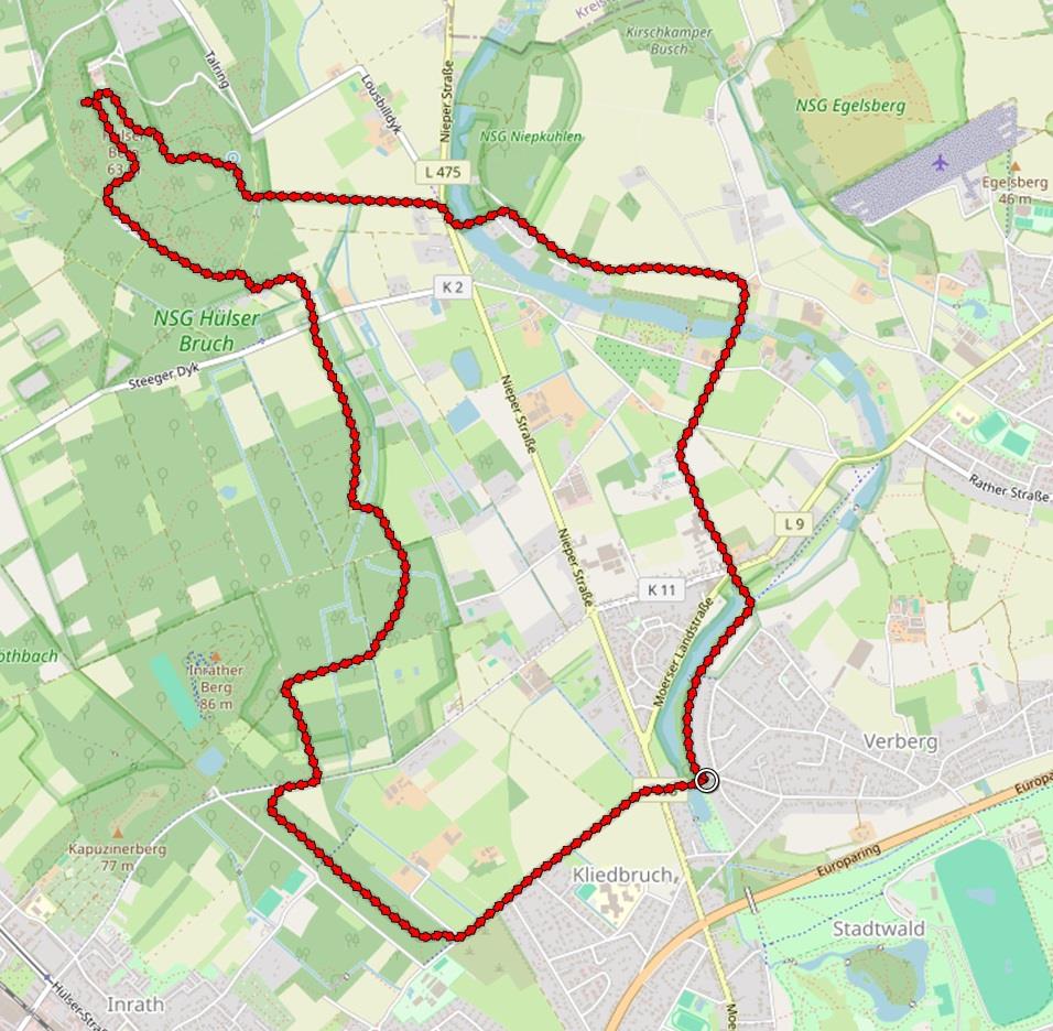 Das nutze ich für eine 13 km lange Wanderung mit Doxi am Nordrand von Krefeld zum Hülser Berg.Wir starten an den Niepkuhlen nördlich des Krefelder Stadtwalds, einer Kette schmaler Wasserflächen als Reste eines früheren Rheinnebenarms.