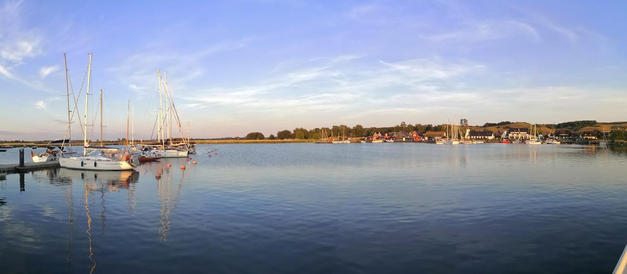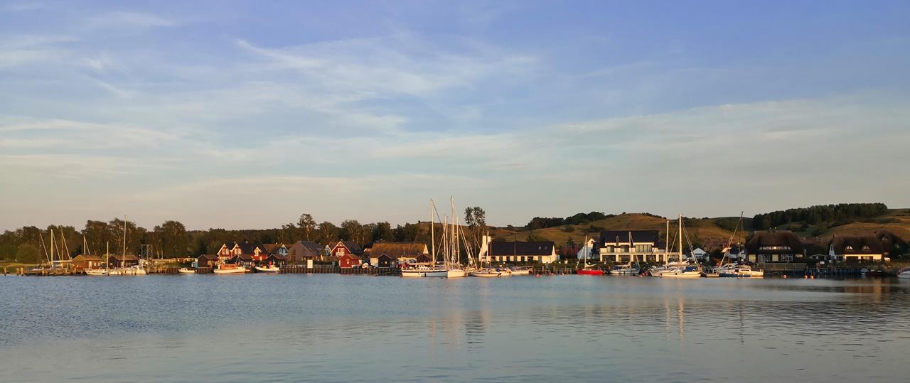 Heike geht am späten Nachmittag zum Schwimmen an den Strand, ich komme mit Doxi etwas später nach und wir genießen die Abendstimmung am Strand. Anschließend fahren wir mit den Fahrrädern zum Hafen von Gager, wo über dem Greifswalder Bodden gerade die Sonne untergeht. Total malerisch sieht das aus. Einfach herrlich.