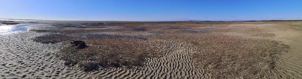 So laufe ich mit Doxi erst einige Kilometer am Strand entlang, bis wir uns auf einem Kutschenweg durch die Salzwiesen in Richtung der Somme bzw. des eindringenden Meerwassers voran arbeiten. So ganz kann man das hier nicht auseinanderhalten.