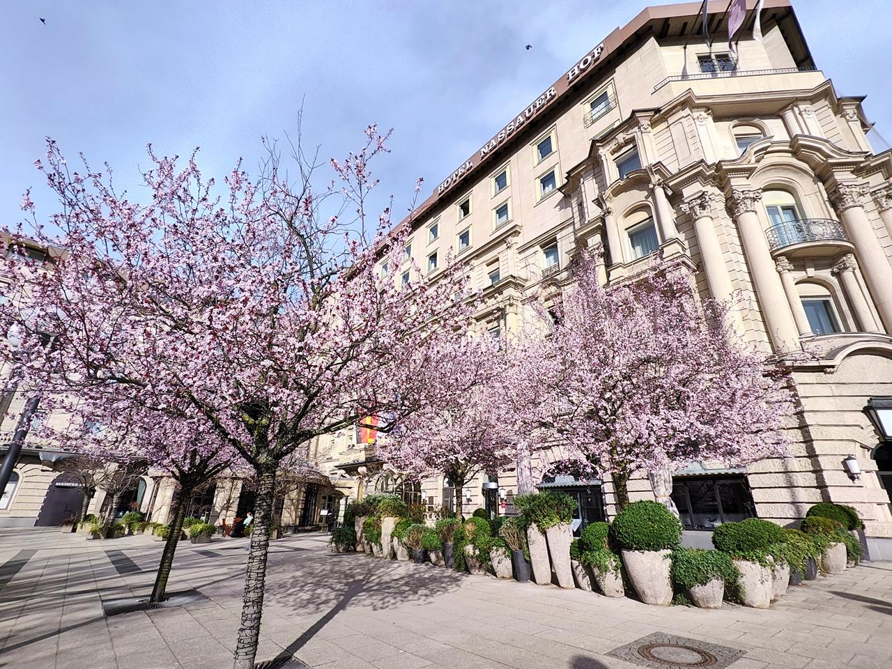 Ich parke mit Doxi etwas außerhalb und laufe rund 2,5 km entlang der Liebricher Allee ins Zentrum, einer Prachtstraße mit vielen noblen Gründerzeitvillen. Im Stadtkern fallen u.a. die Großbauten rund um die Kuranlagen auf. In den Nebenstraßen blühen vor vielen Villen bereits die ersten rosa Zierkirschen. Toll sieht das aus.