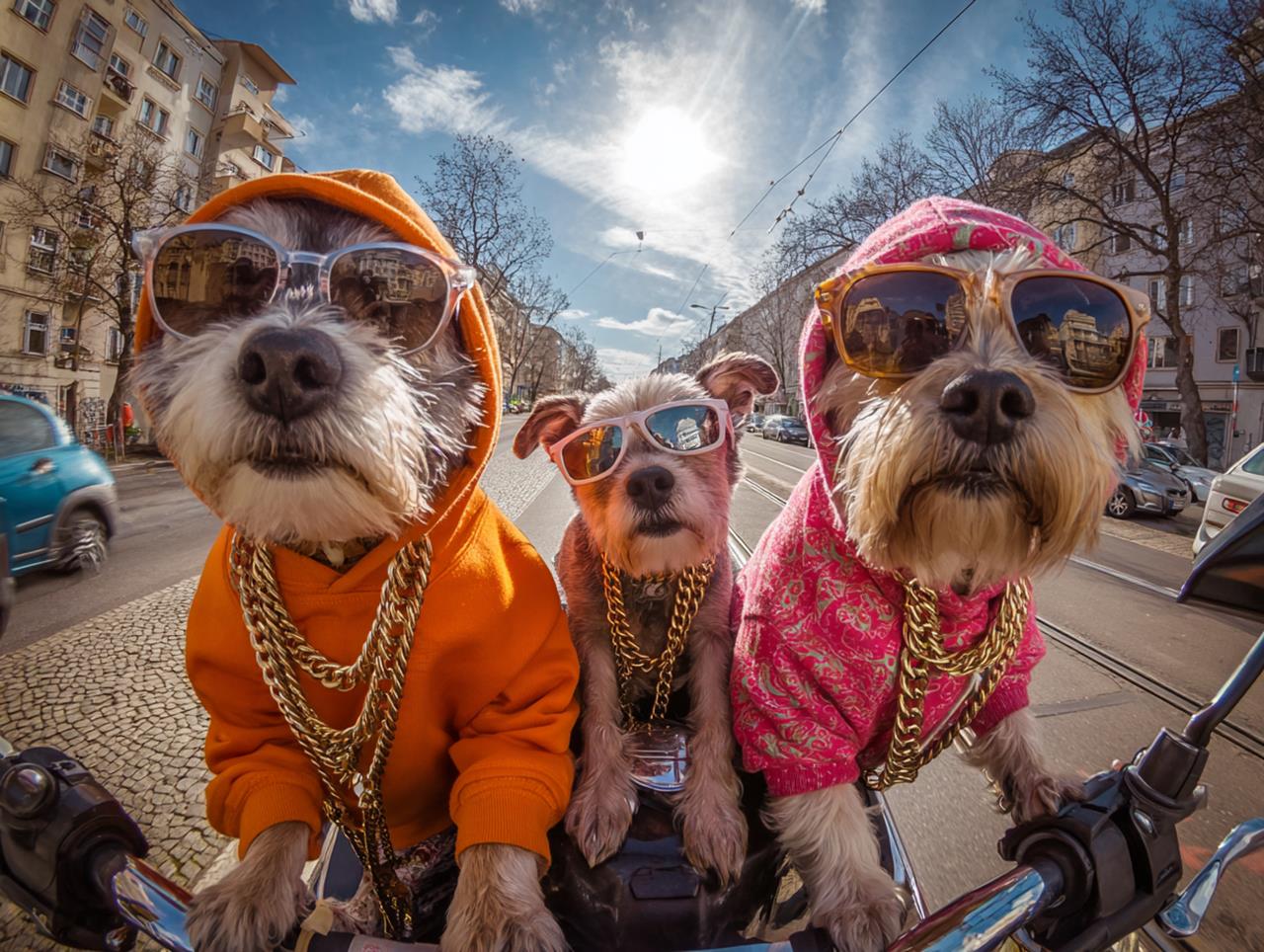 Was jedoch ein komplexer Prompt wie „close-up, cinemanitc, three dogs one big, small and middle but cute wearing colorful hoodies, gold chains and sunglasses, riding a motorcycle through a street, fisheye lens, sunny day, stylish and funny“ aus der Midjourney-KI herauszukitzeln vermag, kann man hier in den Bildern sehen.