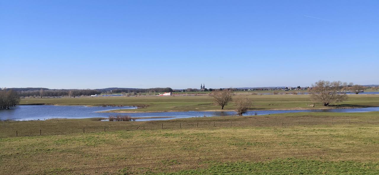 Über den Strom hinweg geht der Blick zum Dom von Xanten. Dessen Innenstadt befindet sich jenseits der Bislicher Insel, einem ehemaligen Rheinarm und heutigem Vogel- und Naturschutzgebiet auf der gegenüberliegenden Rheinseite.