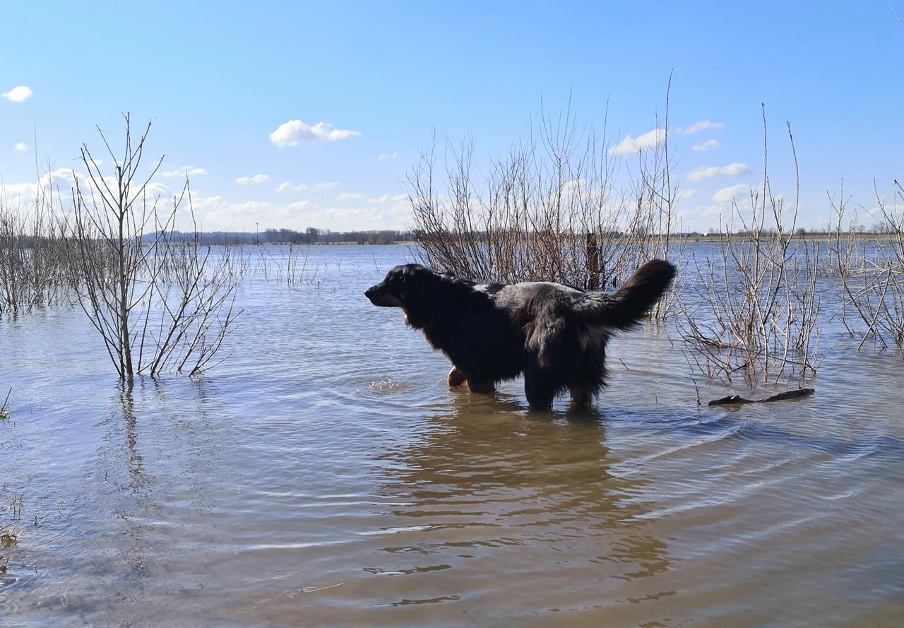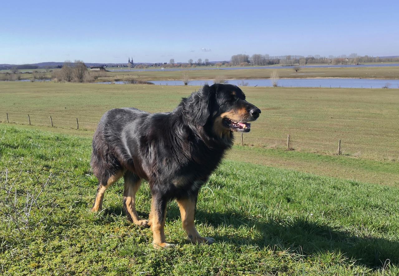 Bei herrlichem Sonnenschein bin ich mit Doxi heute die 15 km lange Storchenroute bei Bislich am nördlichen Niederrhein zwischen Wesel und Rees gelaufen. Im ersten Teil der Strecke, die zahlreiche Storchennester verbindet, laufen wir immer am Rhein entlang.