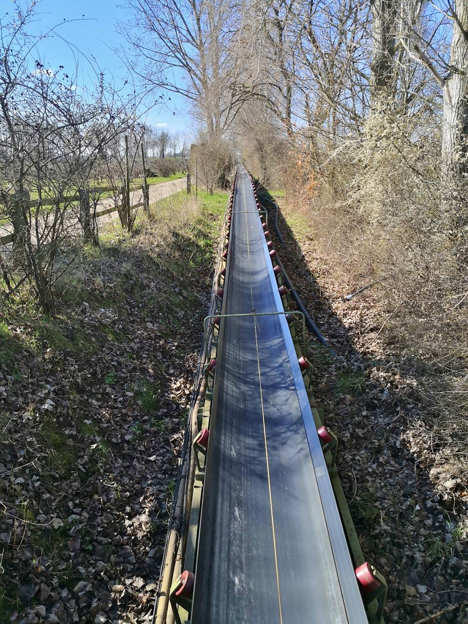 Über lange Förderbänder wird der Aushub aus den Kiesgrubern durch Feldern und Obstplantagen zu einem zentralen Sammelpunkt transportiert