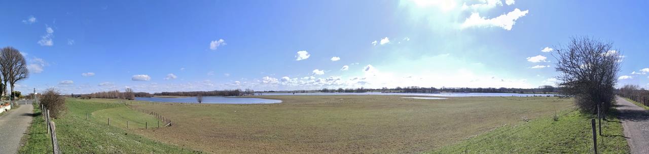 Panoramabild von den Rheinauen zwischen der Fähre und dem Dorfkern von Bislich