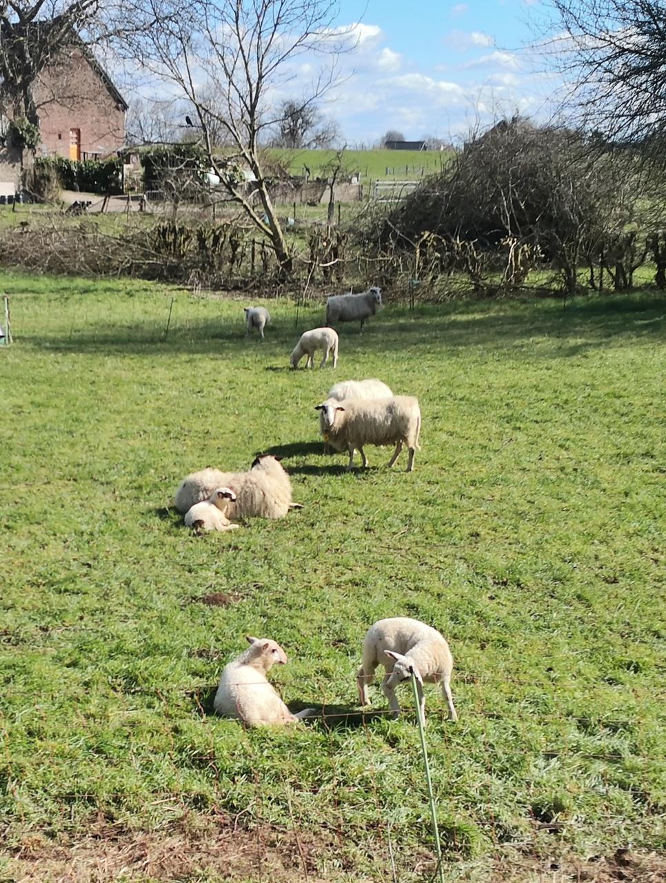 Bauernhofidylle hinter dem Rheindeich mit Pferden, Schafen und Störchen (Im Hintergrund Bildmitte)