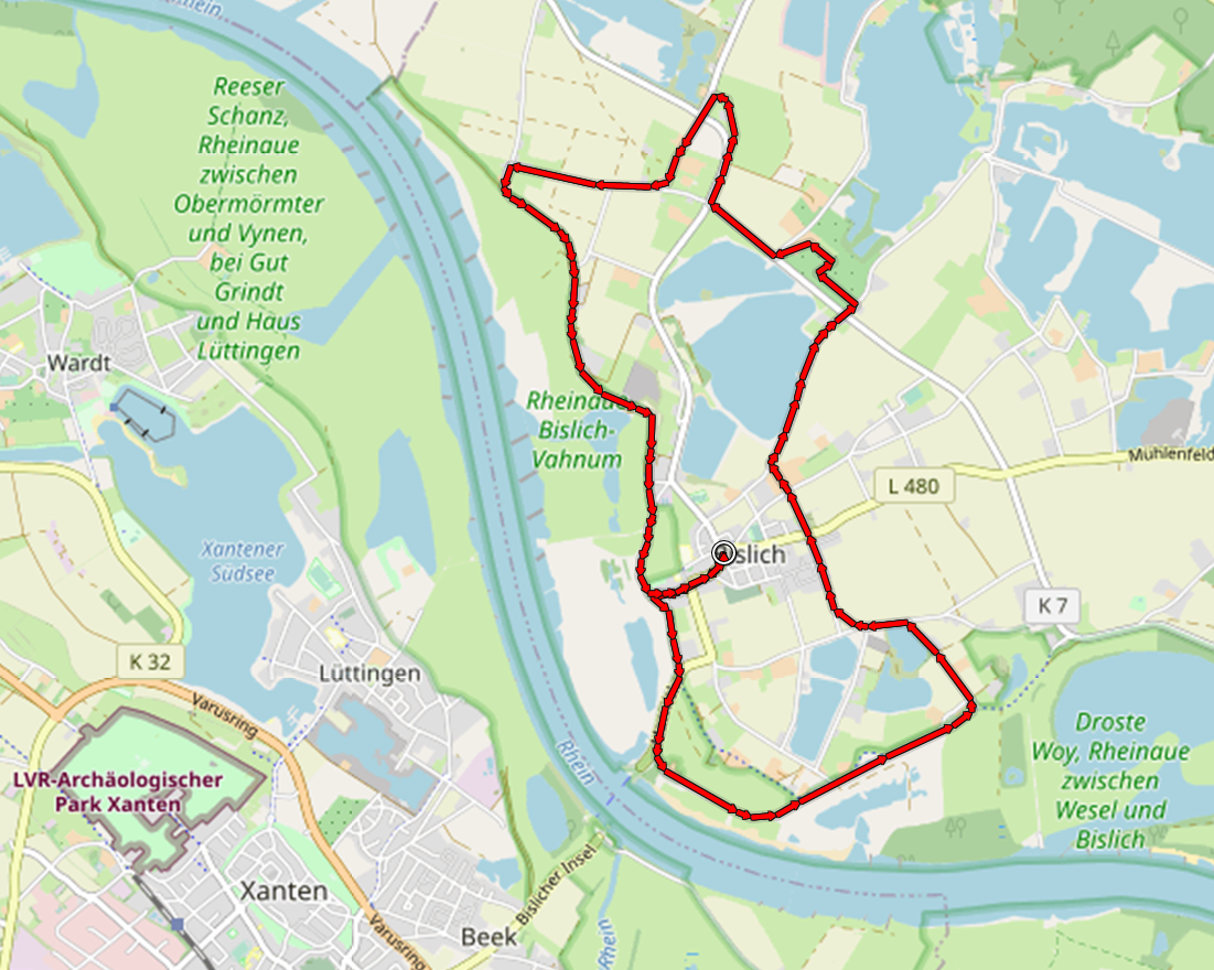 Im zweiten Teil führt die Tour weg vom Rhein über Land, vorbei an schönen Bauernhäusern und zahlreichen Kiesgruben, die das Gebiet durchziehen. Südlich von Bislich stoßen wir dann wieder auf den Rhein und folgen diesem zurück zu unserem Startpunkt, den wir nach knapp vier Stunden wieder erreichen.