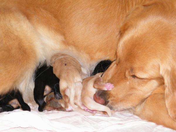 Was eine gesunde Dosis Oxytocin doch bewirken kann: Bellis hat Dank des Geburts- und „Kuschel“-Hormons voll auf Mama umgeschaltet. Sie verlässt die Wurfkiste nur noch für das Notwendigste und kümmert sich ansonsten liebevoll um die Kleinen.