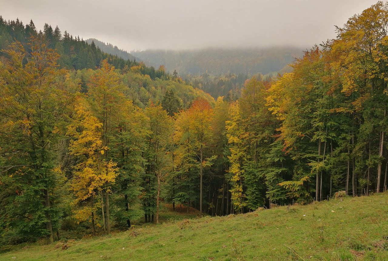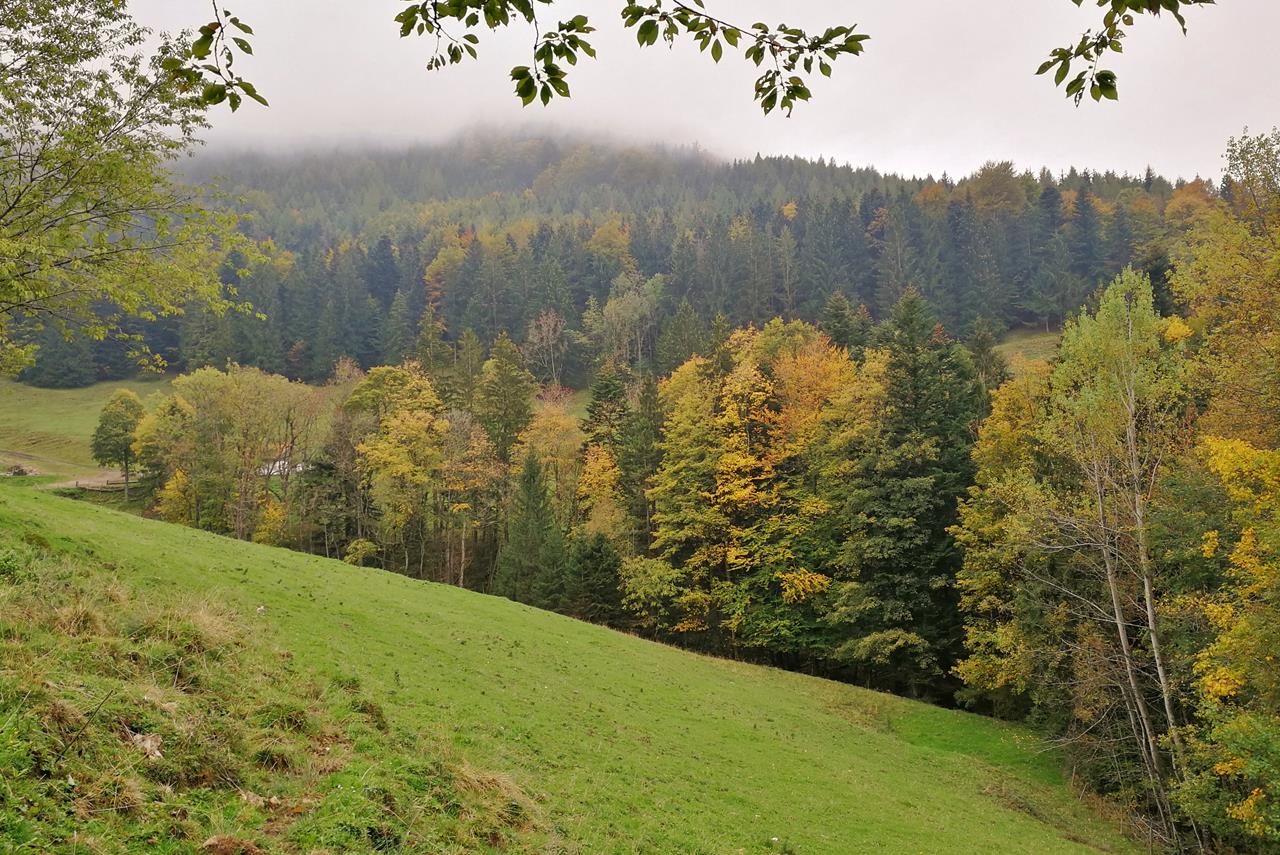 Die Stimmung wird herbstlich trüb, aber auch ein wenig bunt. Je höher wir steigen, desto farbenfroher leuchten uns einzelne Laubbäume entgegen. Das dunkle Grün des Nadelswalds ist durchsetzt mit roten, gelben und orangen Sprengseln.