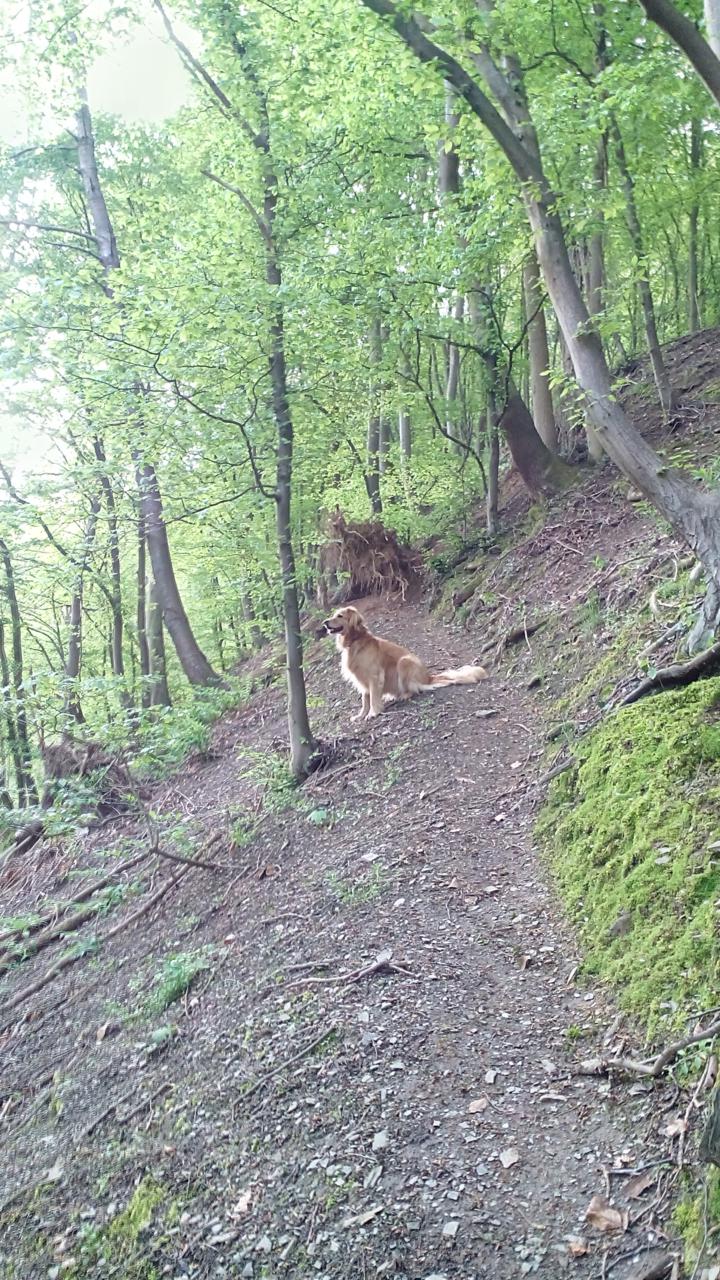 Von dort laufen wir ein wenig in Richtung der Saffelburg durch die Weinstöcke bergaufwärts. Eine große Runde wird es nicht, denn Heike laboriert an einer Bänderdehnung im rechten Fuß, Doxi leidet unter Arthrose.