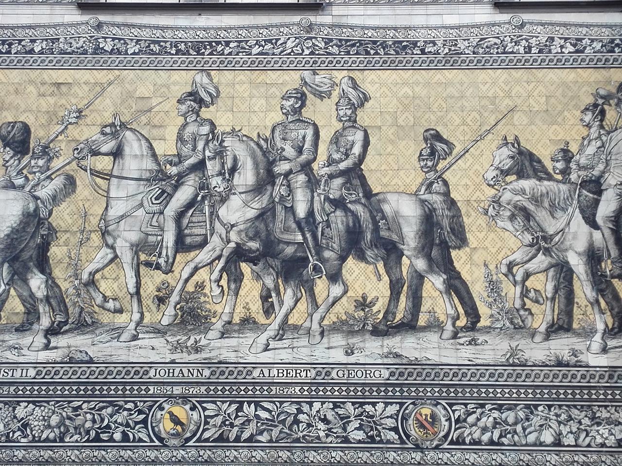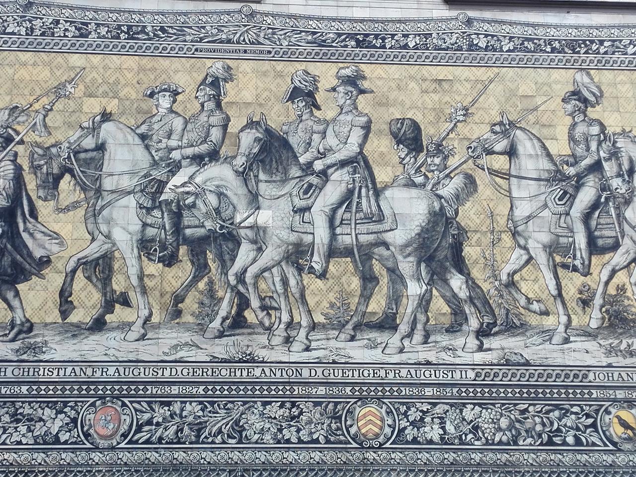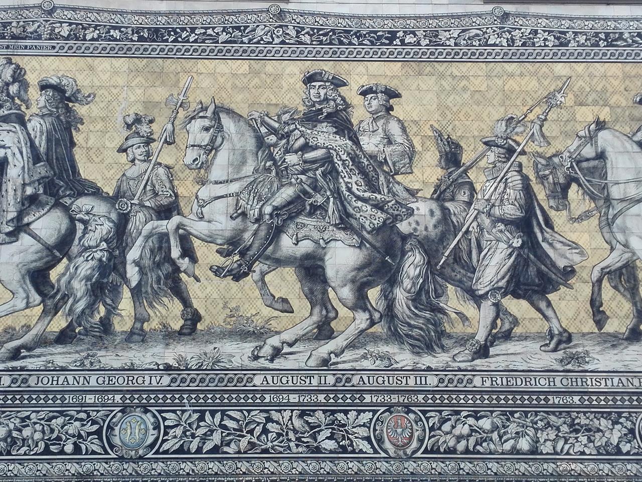 Das überdimensionale Bild besteht aus rund 23.000 Fliesen aus Meißner Porzellan.Es stellt die Ahnengalerie der zwischen 1127 und 1873 in Sachsen herrschenden 34 Markgrafen, Herzöge, Kurfürsten und Könige aus dem Geschlecht des Fürstenhauses Wettin dar und gilt als das größte Porzellanbild der Welt.