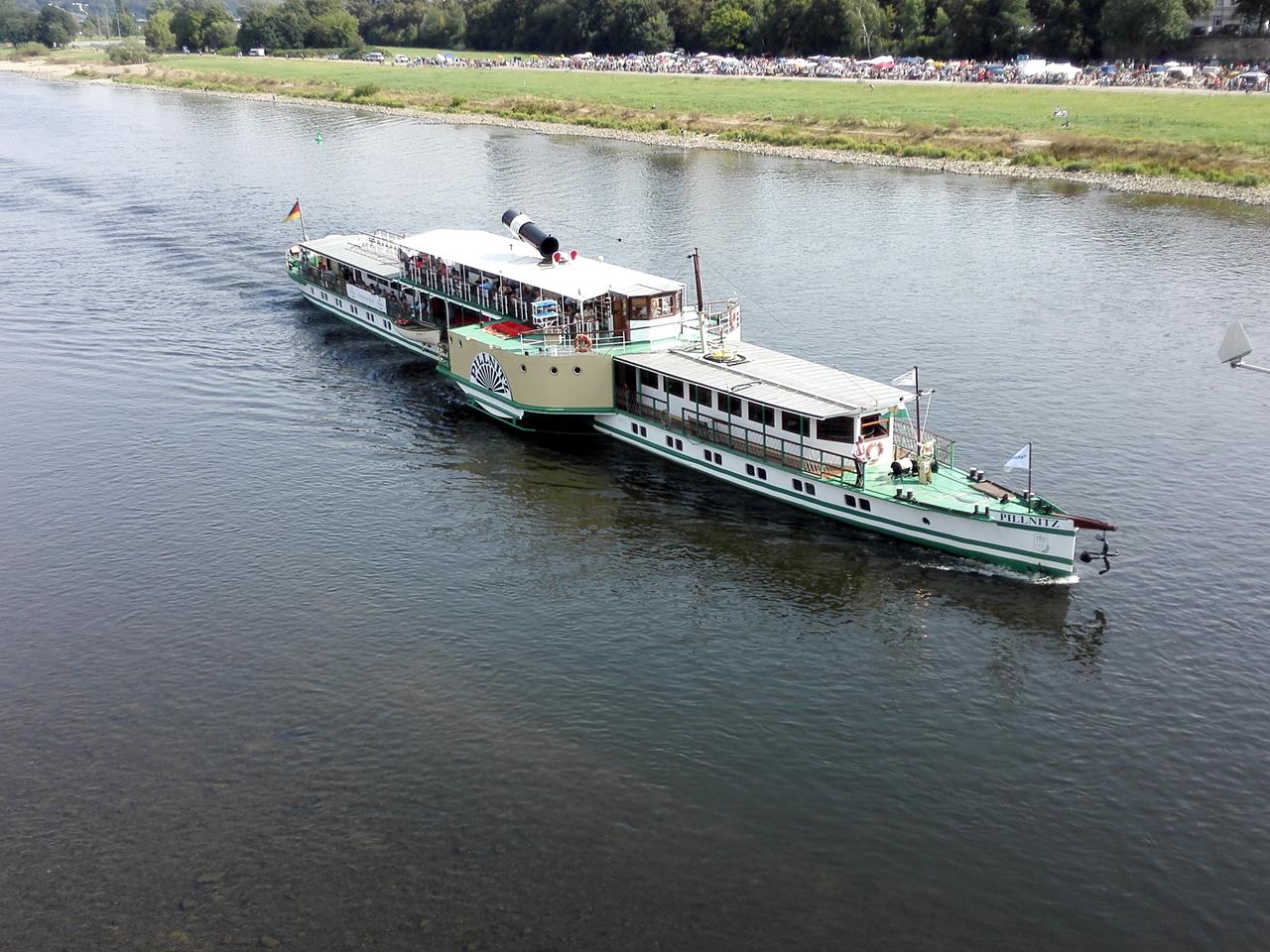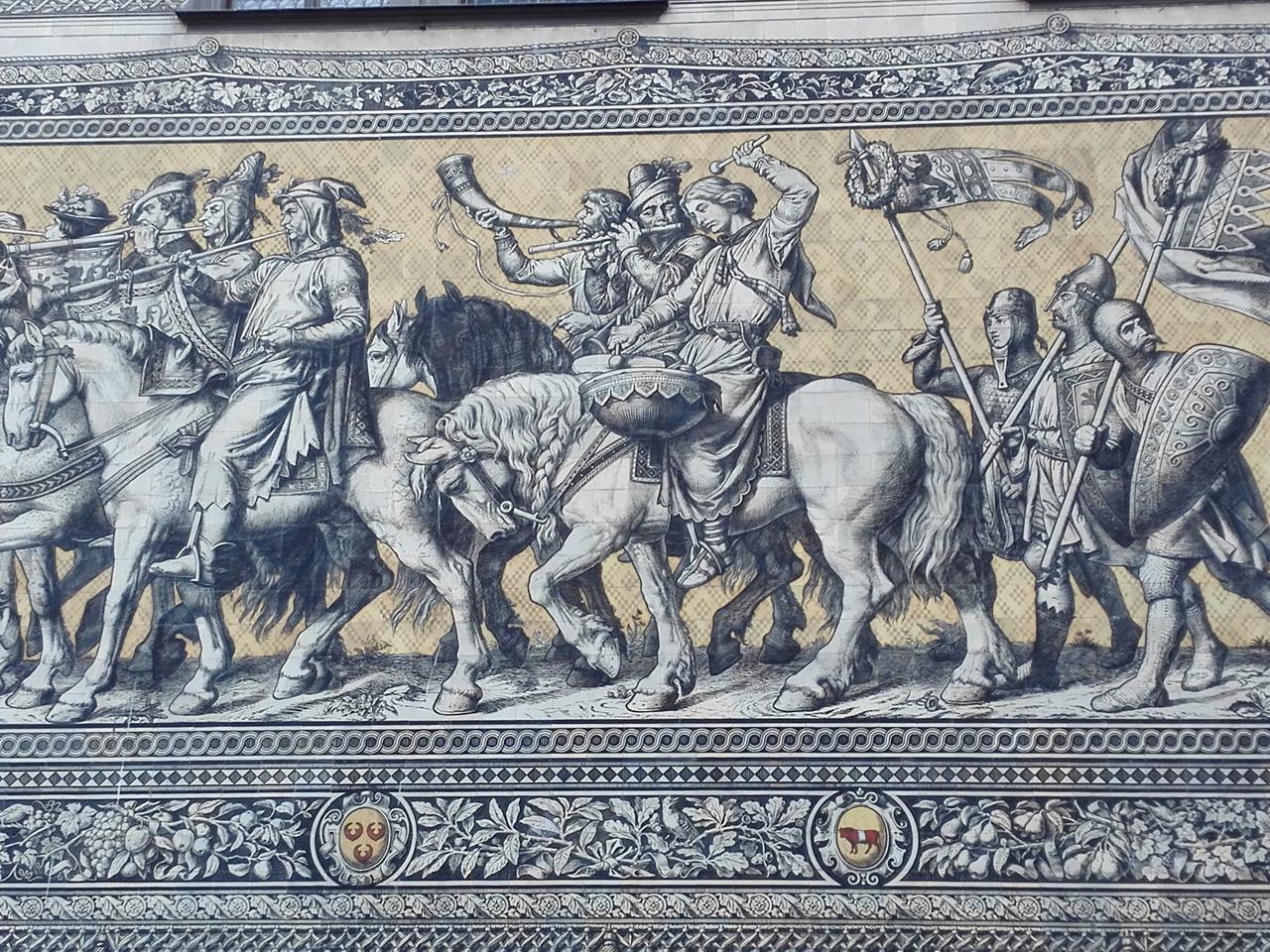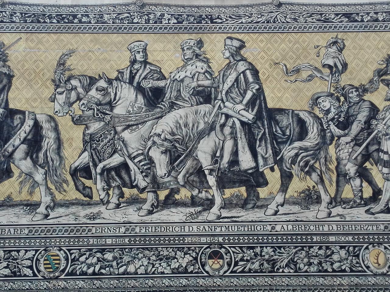 Das überdimensionale Bild besteht aus rund 23.000 Fliesen aus Meißner Porzellan.Es stellt die Ahnengalerie der zwischen 1127 und 1873 in Sachsen herrschenden 34 Markgrafen, Herzöge, Kurfürsten und Könige aus dem Geschlecht des Fürstenhauses Wettin dar und gilt als das größte Porzellanbild der Welt.