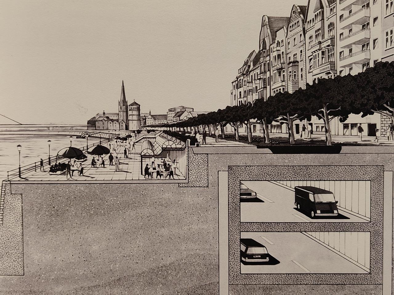 Um das Jahr 1900 hatte sich die Stadt mit einer Uferpromenade zwischen Altstadt und Rhein schon einmal hübsch gemacht. Die erste stählerne Rheinbrücke existierte bereits, Dampfschiffe auf dem Fluss kündeten von der Aufbruchstimmung einer neuen Zeit. Doch dann kam der Erste Weltkrieg und 20 Jahre später der Zweite Weltkrieg und mit ihm massive Zerstörungen in der städtischen Infrastruktur. Wie viele westdeutsche Großstädte wurde auch Düsseldorf beim anschließenden Wiederaufbau als autogerechte Stadt neu gedacht.