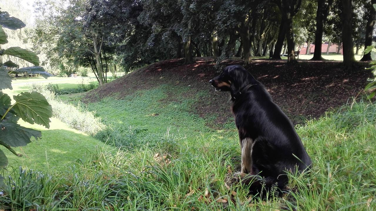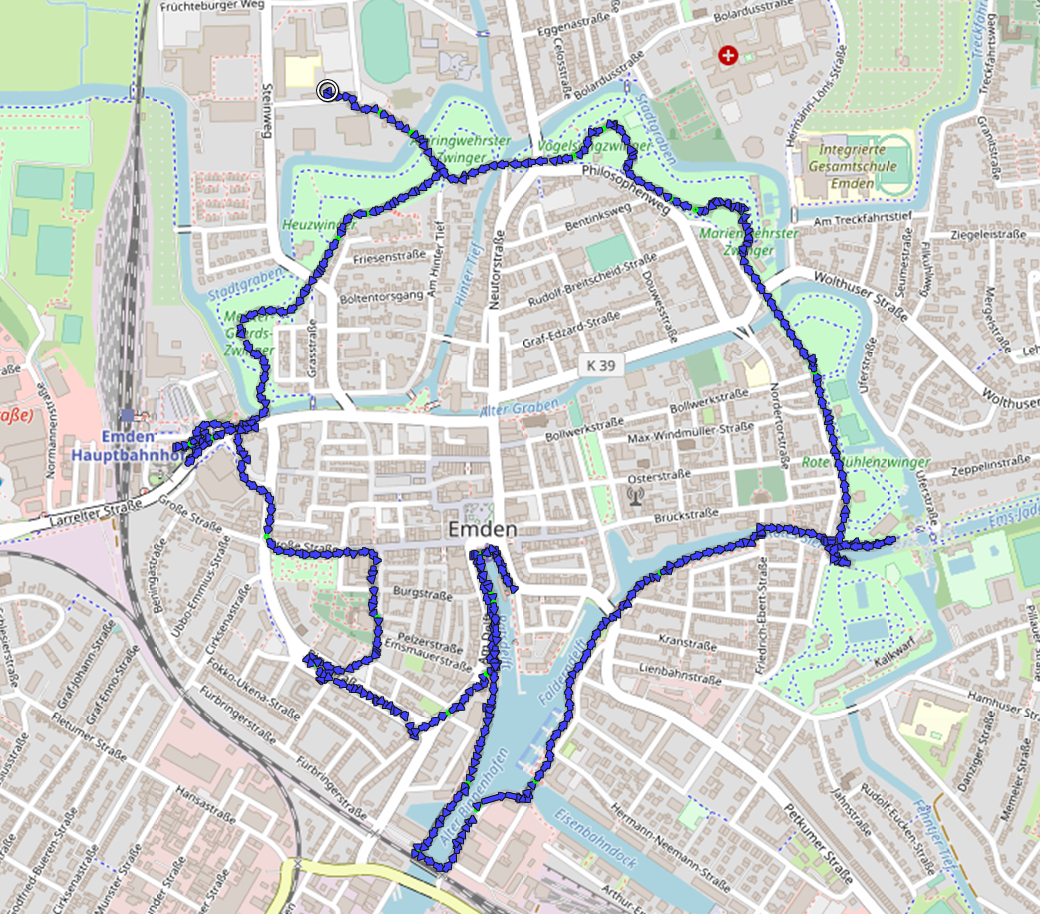 Mit Doxi wandere ich von unserem kostenlosen Womo-Stellplatz an der Friesentherme zunächst über den Wall zum Bahnhof und dann durch die Stadt zum Binnenhafen und weiter über die Wallanlagen zurück.