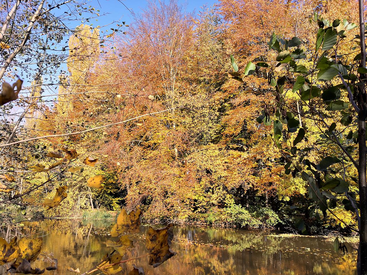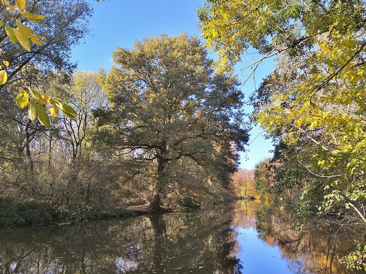 Vom Startpunkt ging es direkt zur träge dahinfließenden Erft, in der sich zurzeit die herbstlich bunten Laubbäume spiegeln. Heute sogar unter einem fast makellos blauen Himmel.