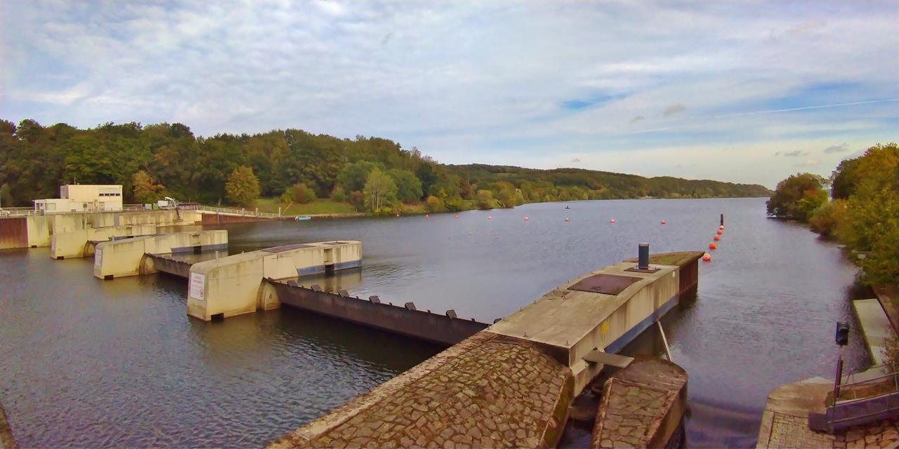 Vom Schloss laufen wir in Richtung des hübschen Kemnader Sees, der seit Ende der 1970er Jahr das Wasser der Ruhr aufstaut. Auf dem großen Klappenwehr am westlichen Seeende überqueren wir die Ruhr und laufen nun in westlicher Richtung über den gepflasterten Uferpfad. Auf diesem „Leinpfad“ wurden früher die Schiffe Ruhraufwärts durch Pferde oder Menschen gezogen („getreidelt“).In der Ferne können wir über der Ruhr bereits die Burg Blankenstein erkennen. Bald passieren wir die alte Blankensteiner Schleuse, bevor wir ein Stück Ruhrabwärts auf der großen Autobrücke über das Ruhrtal wieder auf die südliche Flussseite wechseln.