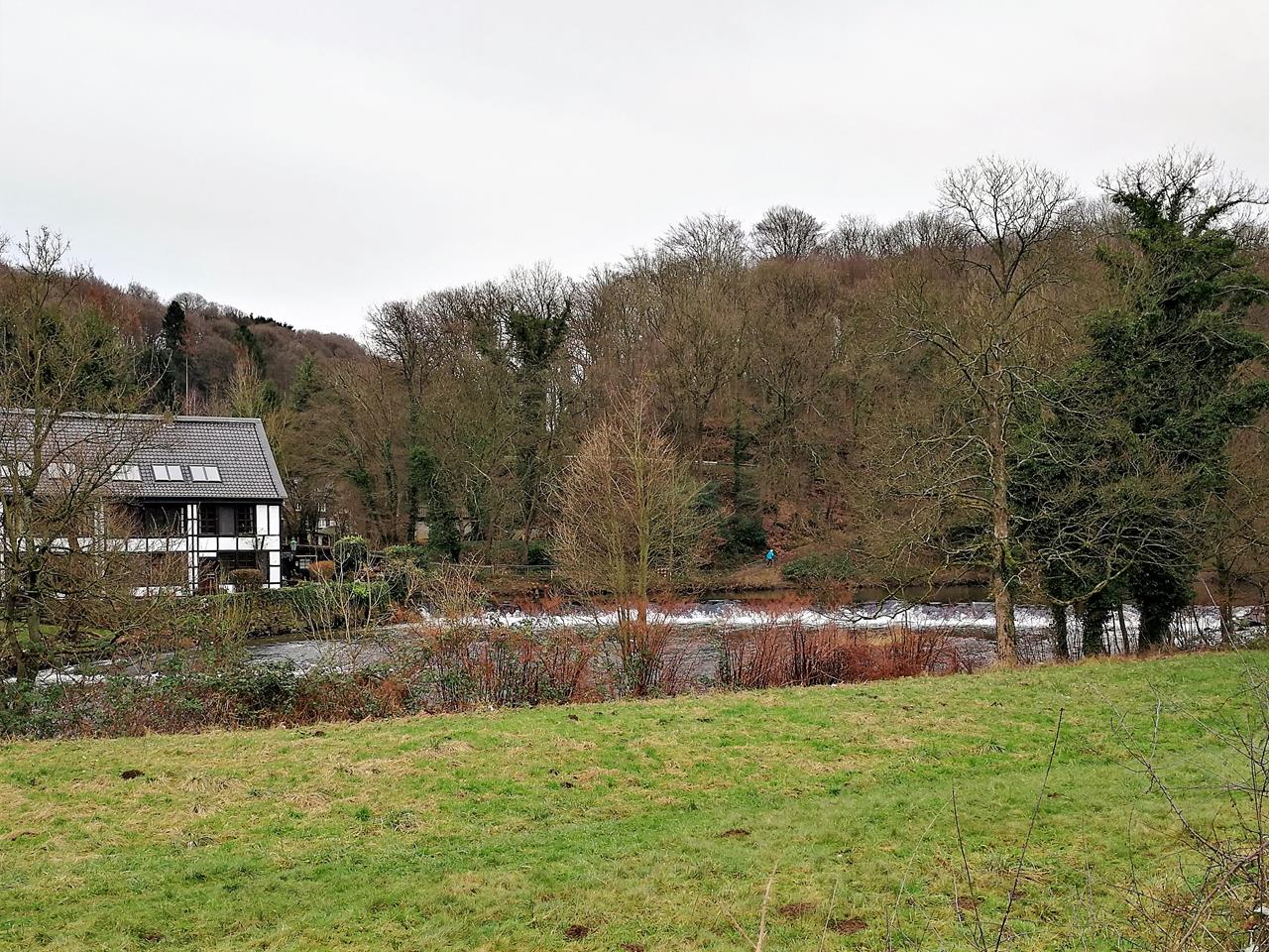 Wir starten in Leichlingen und laufen in nördlicher Richtung stromaufwärts entlang der Wupper. Am gegenüberliegenden Ufer fällt unser Blick auf Schloss Eicherhof und den schönen Eicherhofpark.