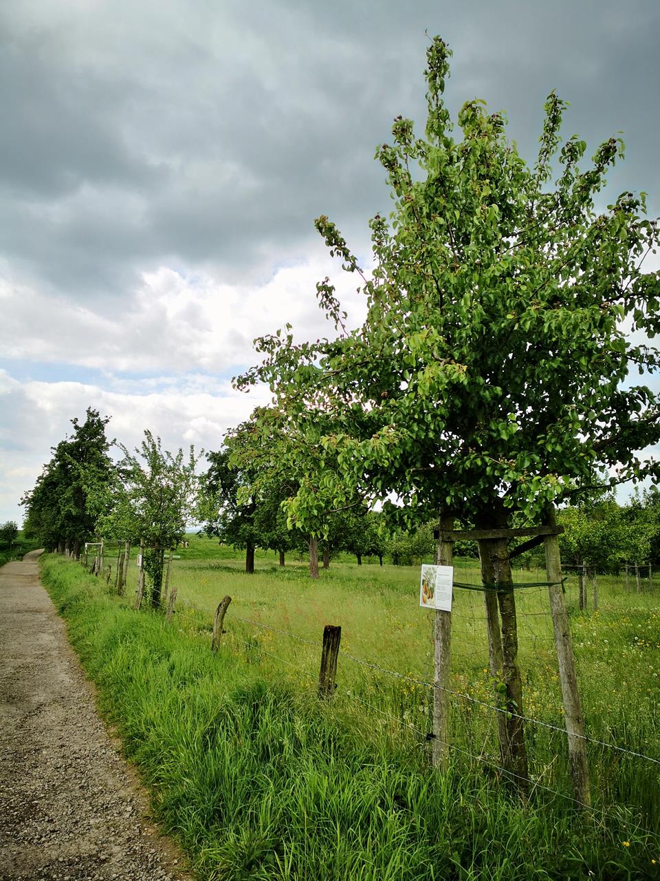 Waren um das Jahr 1900 noch an die tausend Apfelsorten bekannt, beschränkt sich das heutige Marktangebot auf einige wenige Sorten. Erst jetzt beginnt man wieder zu schätzen, dass die frühere Vielfalt auch eine Bereicherung für die Sinnes- und Gaumenfreuden bedeutete. Insbesondere die alten Sorten wie Jacob Lebel, Weißes Seidenhemdchen, Kaiser Wilhelm, Rheinischer Krummstiel und andere werden wieder vermehrt angebaut, wie Infotafeln entlang des Weges verraten. Sehr interessant das alles und vor allem: wunderschön anzusehen.