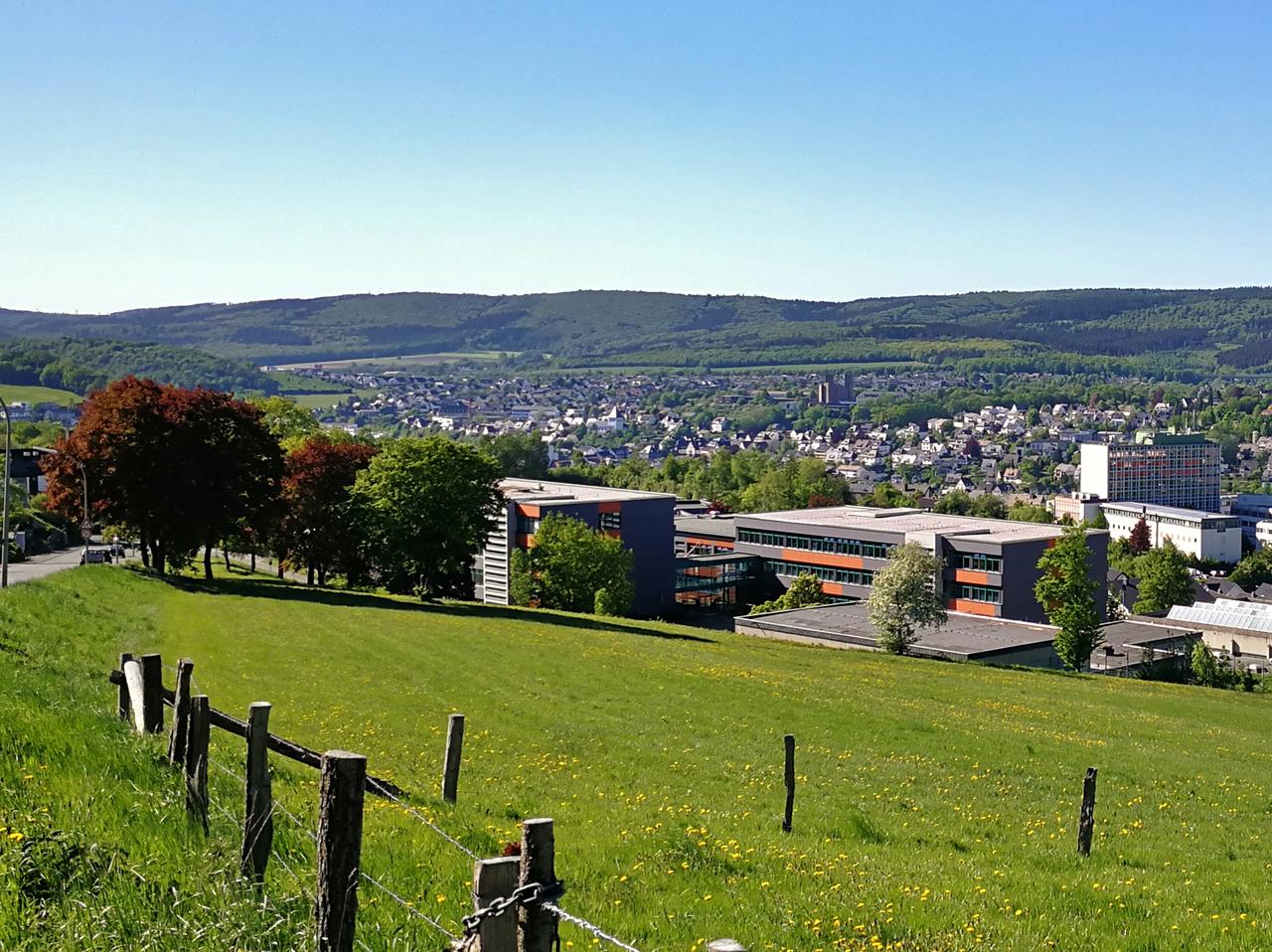 Dazu müssen wir erst einmal von der Talsperre hinunter ins Tal nach Meschede laufen. Dort angekommen, geht es auf der anderen Seite der Stadt wieder hinauf in Richtung des Vogelsangs. Die starke Nachmittagssonne treibt uns dabei von einer Straßenseite zur anderen, immer dorthin, wo Schatten ist.