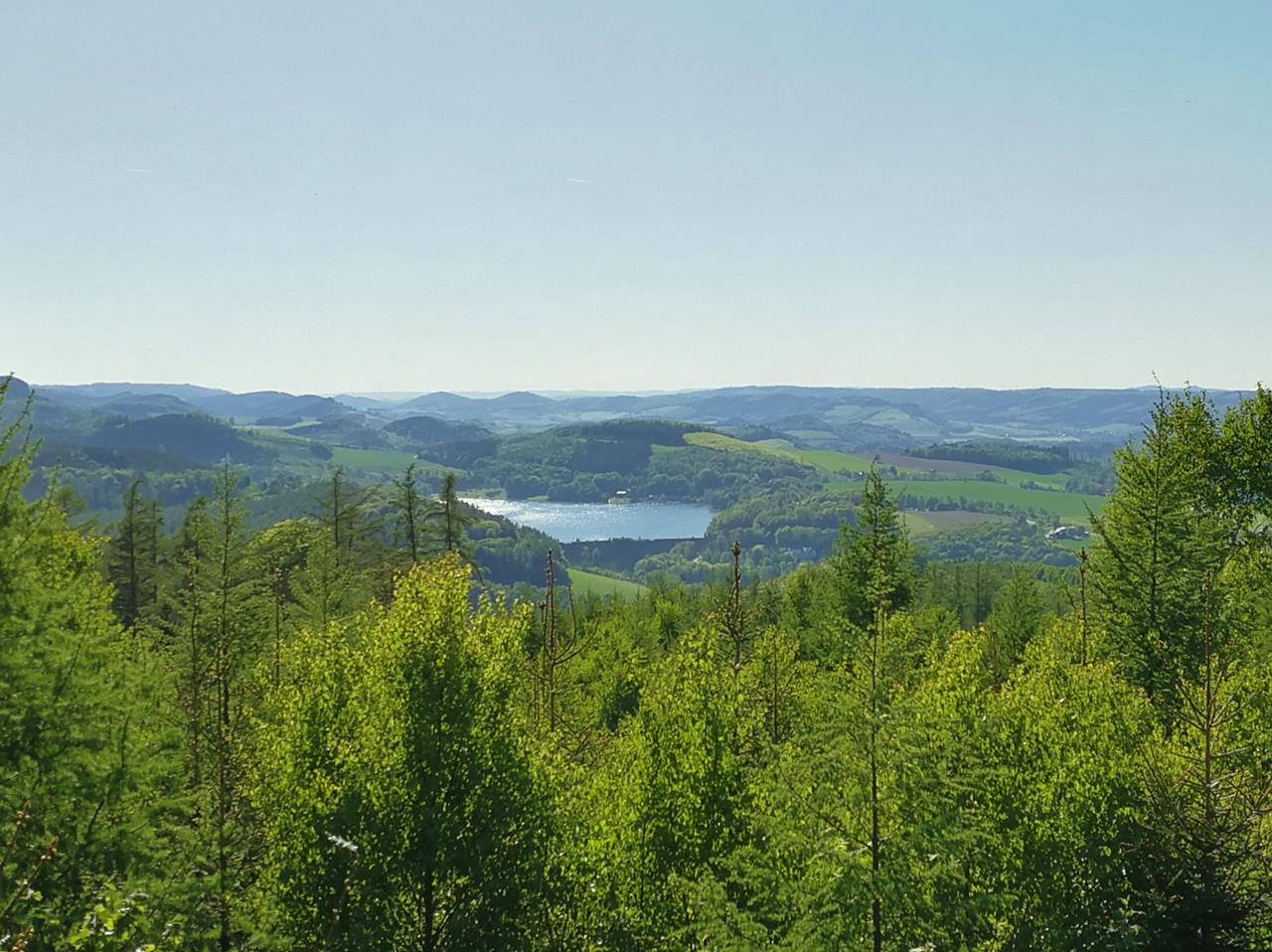 Noch einmal geht es steil bergan. Im Rückblick erscheint nun auch der Hennesee in einiger Entfernung. Deutlich kann man den in der Sonne glitzernden See und die Staumauer erkennen.