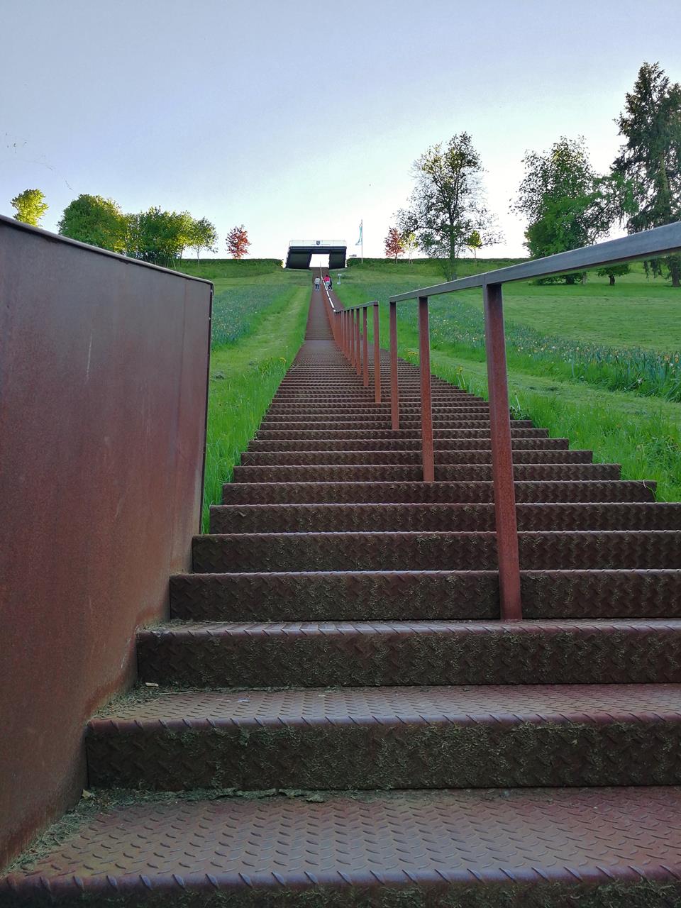 Wir laufen zunächst über die 370 Meter lange Staumauer, die einen schönen Blick hinunter nach Meschede bietet. Auf halber Länge passieren wir die 2015 eingeweihte „Himmelstreppe“, die vom Fuße des Staudamms geradewegs über 328 Stufen hinauf zur Dammkrone führt.
