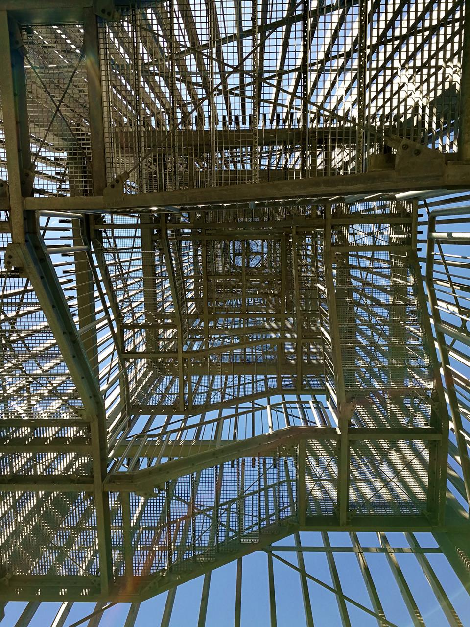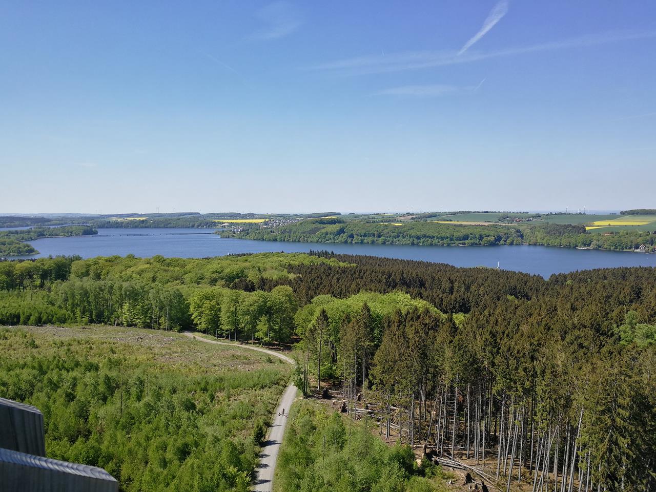 Bei dieser Witterung hat man oben auf dem Turm in 40 Meter Höhe einen fantastischen Fernblick über den Möhnesee, den Arnsberger Wald und die angrenzenden Gemeinden. Heute sind sogar die Kraftwerkstürme bei Hamm in der norddeutschen Tiefebene nördlich des Haarstrangs ganz deutlich zu erkennen. Toll ist das.