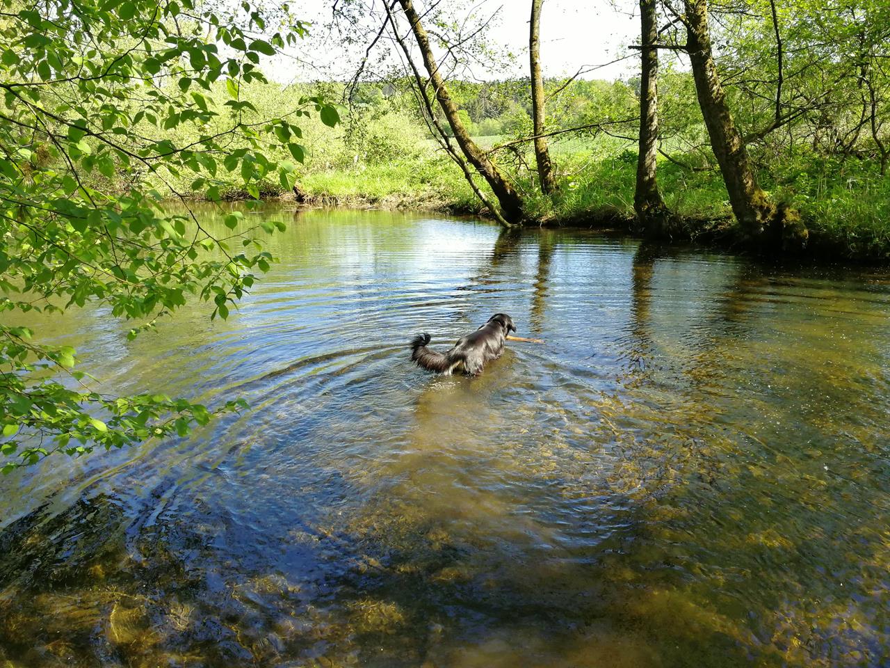 Als ich oben noch die Aussicht bestaune, höre ich Doxi unten bellen. Ein großer blonder Hovawart-Rüde hat sich ihr genähert und das passt Madame gar nicht. Wieder unten angekommen, lerne ich den hübschen Bentley und seinen Besitzer kennen. Unter Hovawart-Haltern tauscht man sich ja gerne aus. Es ergibt sich ein netter Plausch.